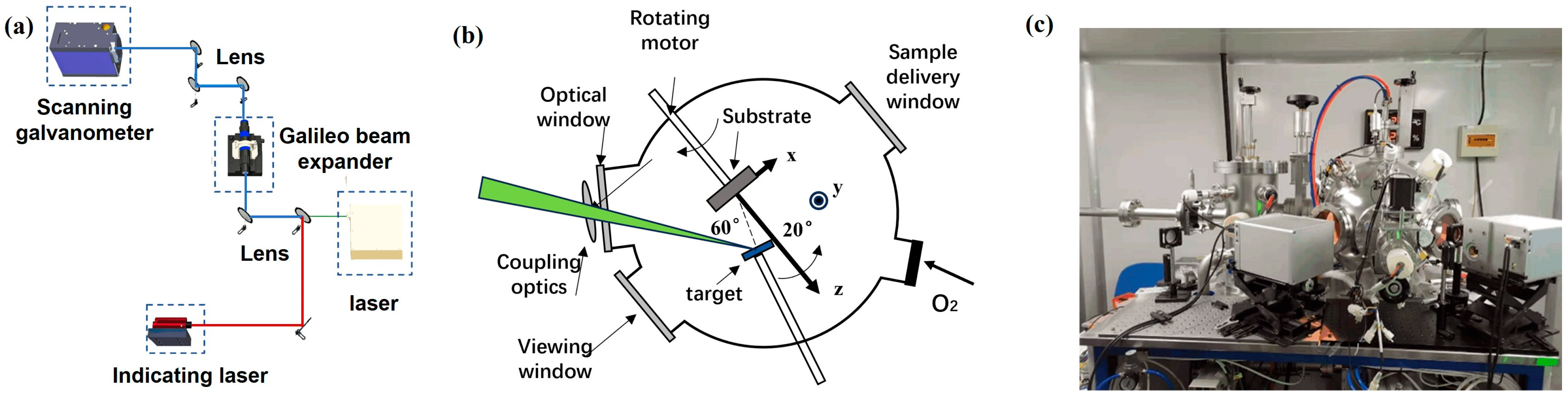 - Vacuum evacuation: All windows and valves of the deposition chamber were sealed tightly. The mechanical pump and bypass valve were opened first, and the chamber was evacuated until the pressure dropped below 10 Pa. Subsequently, the bypass valve was closed, and the foreline valve and turbomolecular pump were activated. After the turbomolecular pump reached its maximum rotation speed of 27,000 rpm, the gate valve was opened and set to full open. The ionization vacuum gauge (ZJ-12/CF35, Ruibao Elec. Tech. Co., Ltd., Shanghai, China) of the coating chamber was turned on, and the evacuation process continued until the chamber pressure fell below 10−4 Pa.