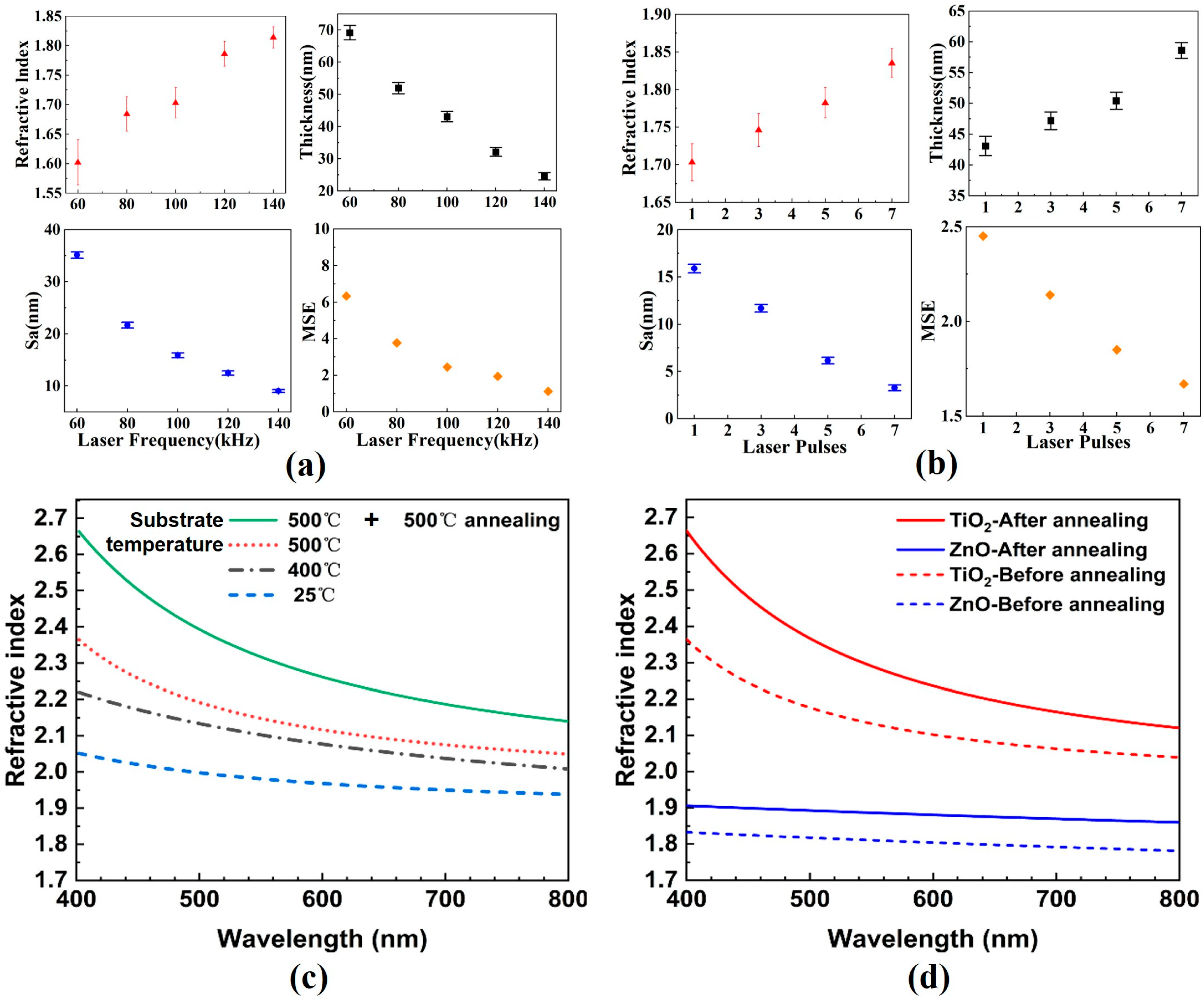 | Laser Frequency (kHz) | Sa (nm) ± SD | Thickness (nm) ± SD | Refractive Index ± SD | MSE |