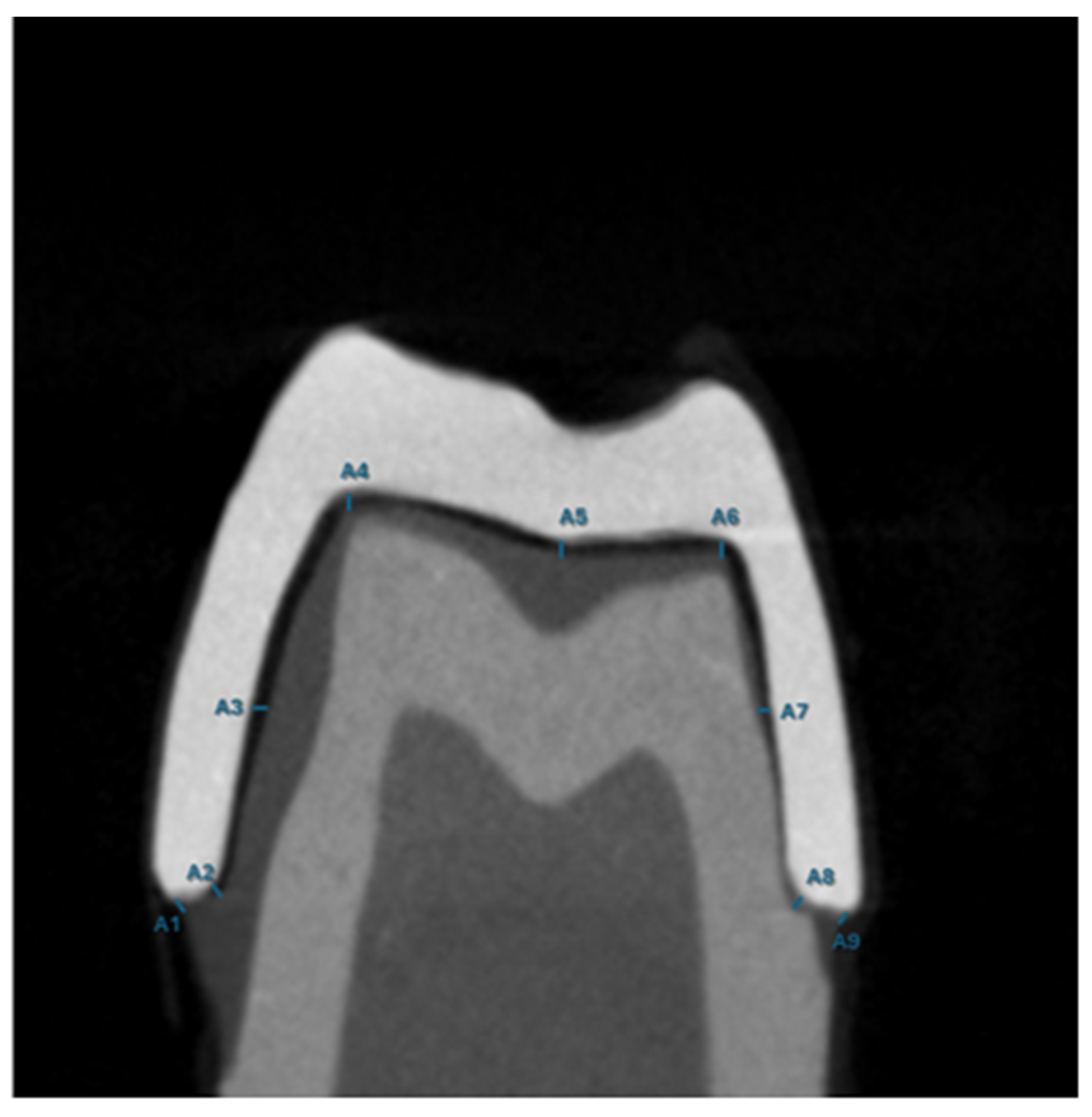 - Akat, B.; Şentürk, A.; Ocak, M.; Kılıçarslan, M.A.; Orhan, K.; Önder, M.; Gönüldaş, F. Quantitative Evaluation of Marginal and Internal Fit of CAD/CAM Ceramic Crown Restorations Obtained by Model Scanner, Intraoral Scanner, and Different CBCT Scans. Appl. Sci. 2025, 15, 8017. [Google Scholar] [CrossRef]