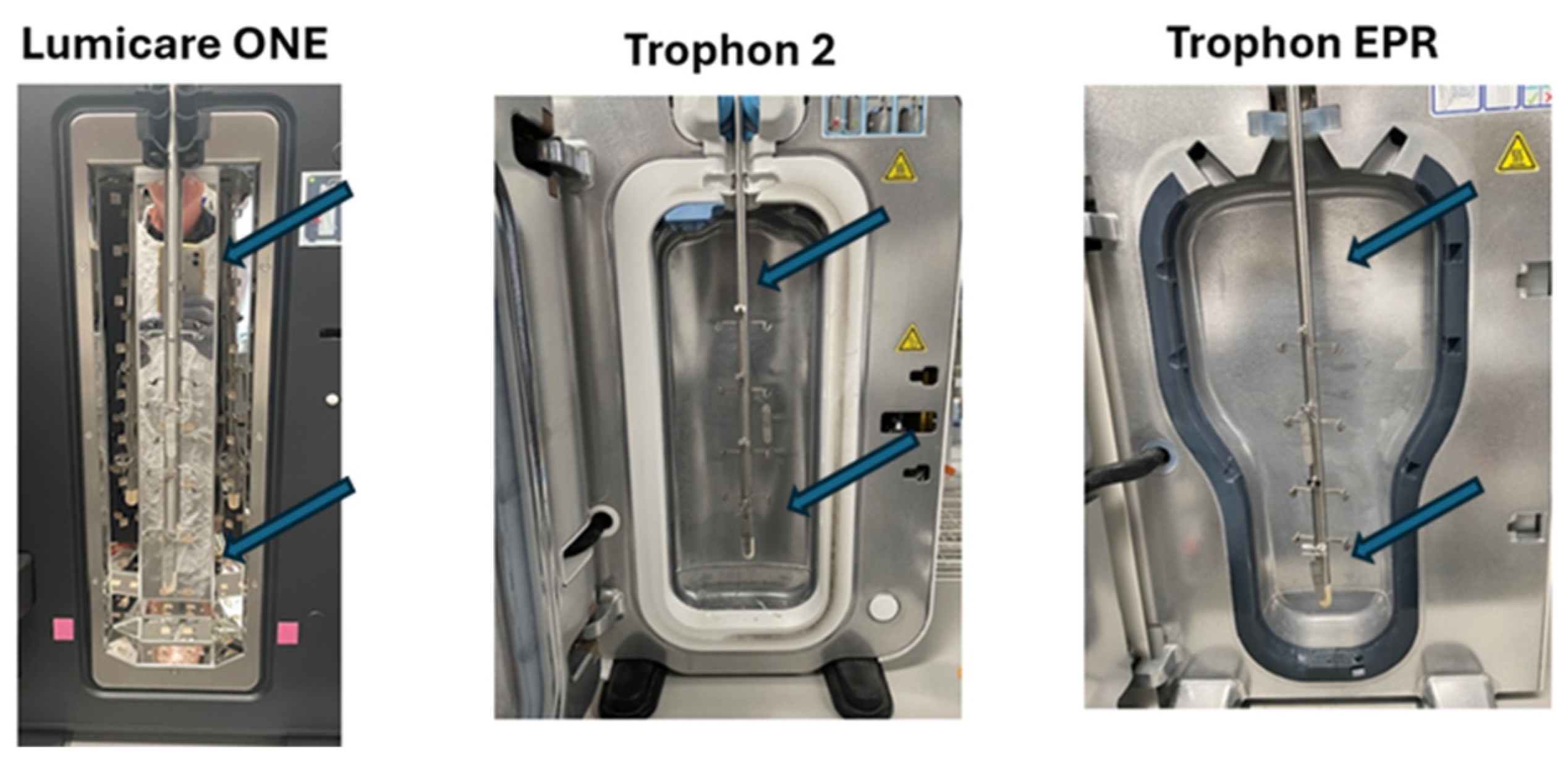 - Rutala, W.A.; Gergen, M.F.; Sickbert-Bennett, E.E. Effectiveness of a Hydrogen Peroxide Mist (Trophon) System in Inactivating Healthcare Pathogens on Surface and Endocavitary Probes. Infect. Control Hosp. Epidemiol. 2016, 37, 613–614. [Google Scholar] [CrossRef] [PubMed]