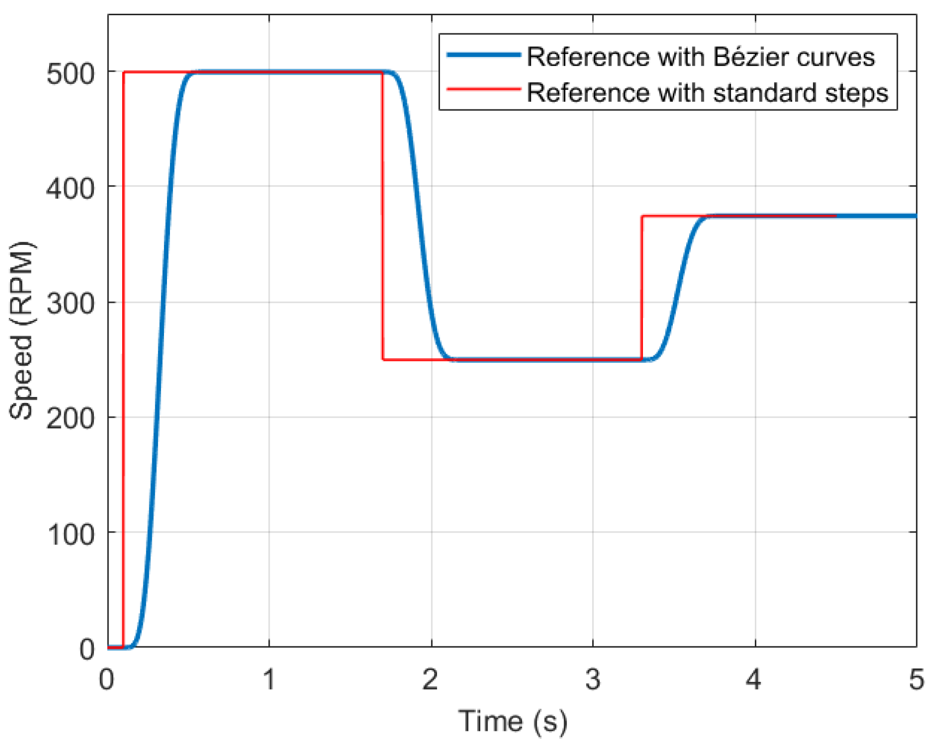 To ensure that speed tracking is not subject to abrupt changes that could induce excessive current spikes, a smooth reference trajectory signal is required. Smooth transitions are achieved using Bézier curves, which provide more convenient, continuous transitions [21,22].