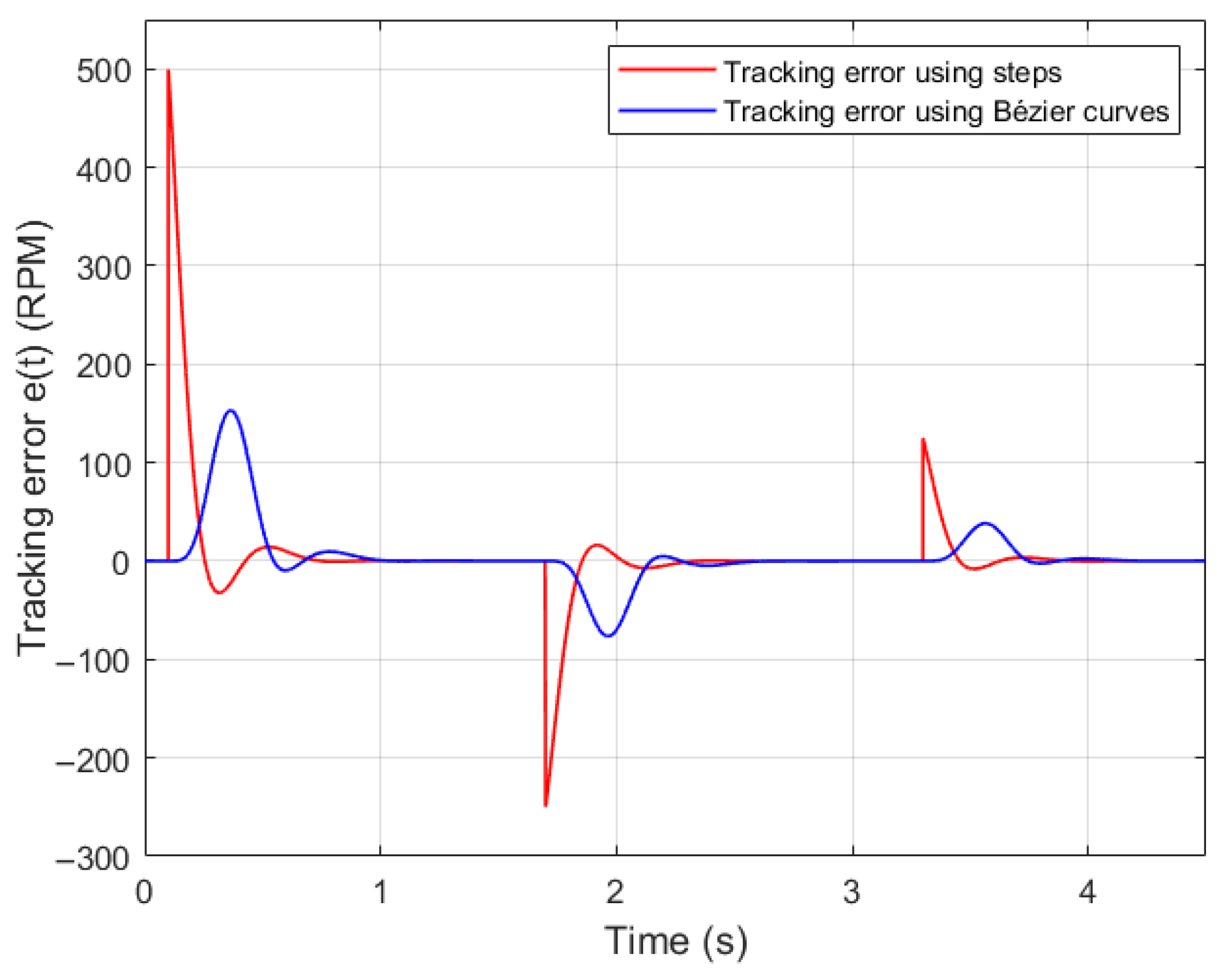 Figure 6 illustrates the speed-tracking error performance. Although the overall response is satisfactory, noticeable short-duration error peaks appear at specific instances in the red plot, whereas these errors are significantly reduced in the blue plot. This confirms that Bézier curves do not result in a loss of tracking performance; rather, they improve the transient response.