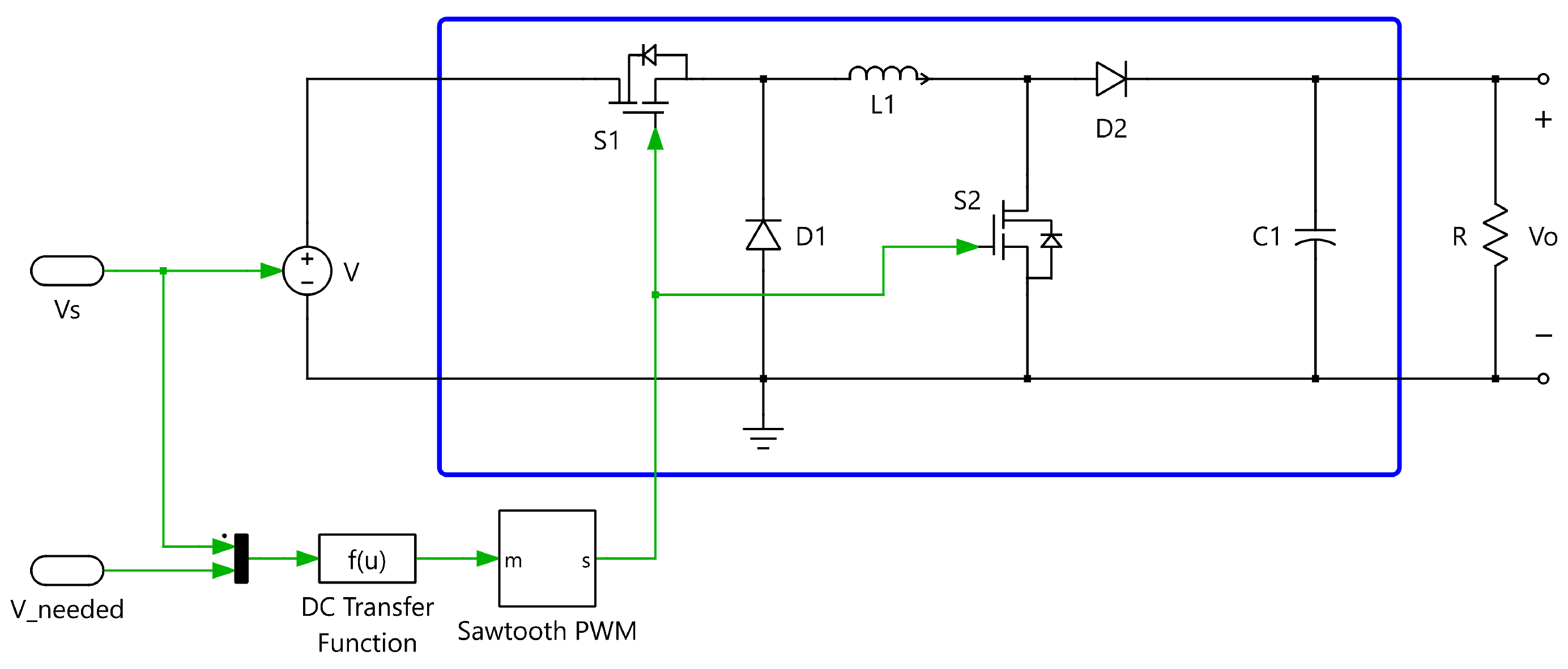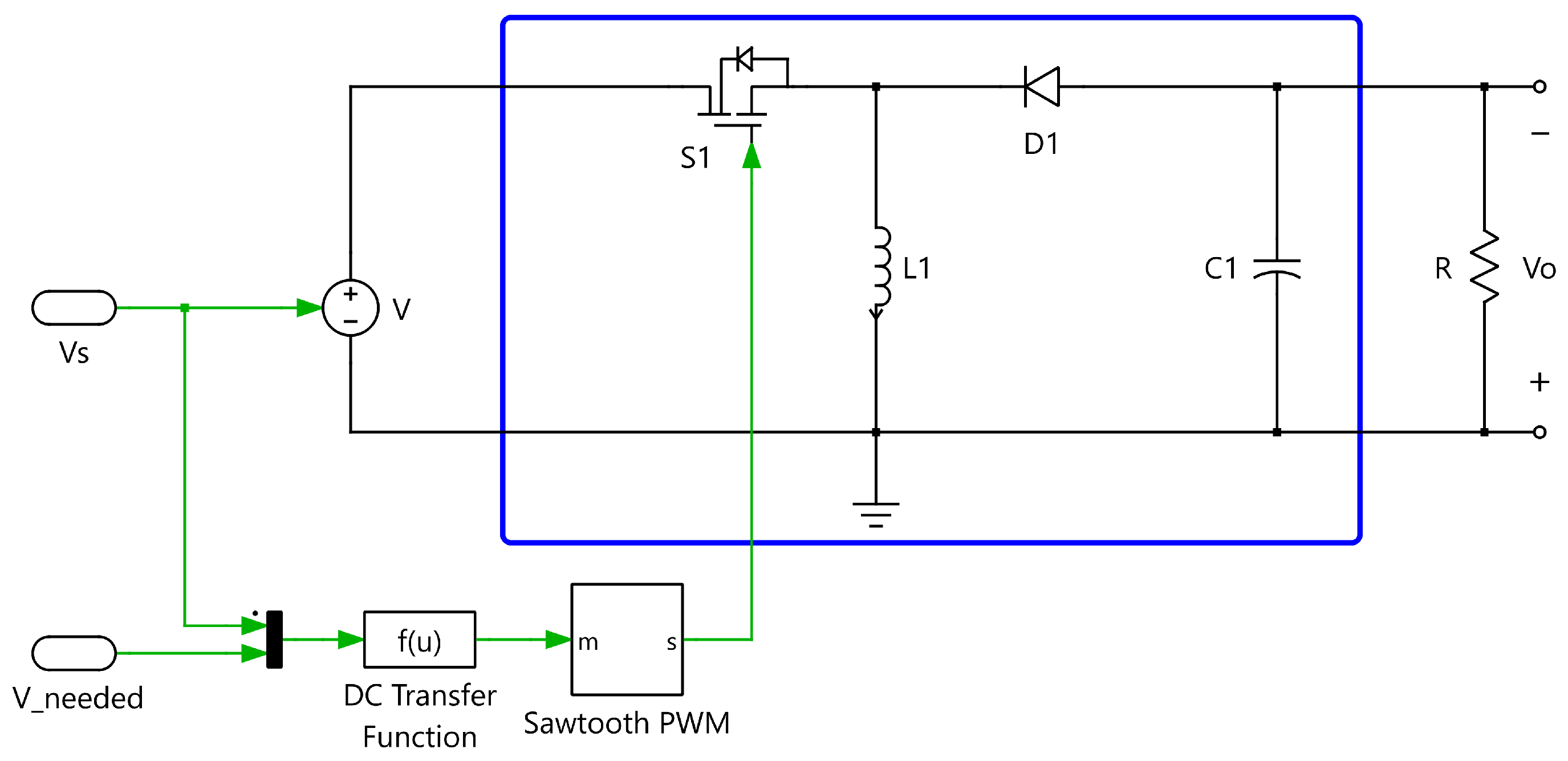 If the negative output voltage represents a limitation for certain connection requirements, a simple solution is to connect two converters in a cascaded (pipeline) configuration. The concept of this approach is discussed in [29], where a Buck and a Boost stage are combined to produce a positive-output Buck–Boost converter, as illustrated in the blue block of Figure 8. This configuration retains the versatility of the traditional Buck–Boost while eliminating the polarity inversion issue, making it suitable for a broader range of applications.