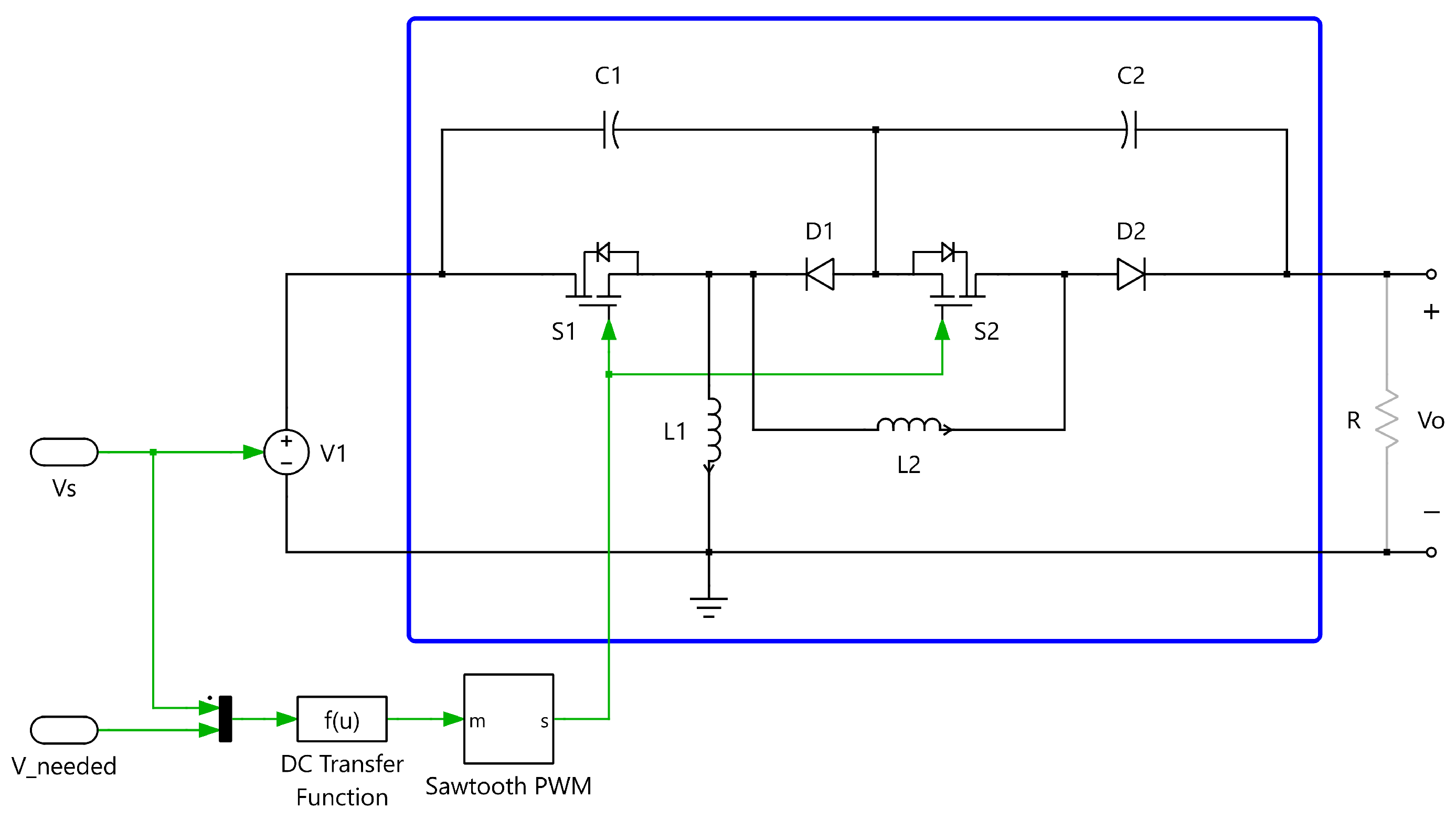 The first converter analyzed is the traditional inverting Buck–Boost converter, shown enclosed in blue in Figure 7. This topology has been widely used in various applications, including modern electronic equipment [26,27], due to its ability to provide an output voltage that can be either higher or lower in magnitude than the input, with an inverted polarity. Its straightforward configuration and control simplicity make it an excellent reference for evaluating the behavior of more complex converter topologies under similar operating conditions.