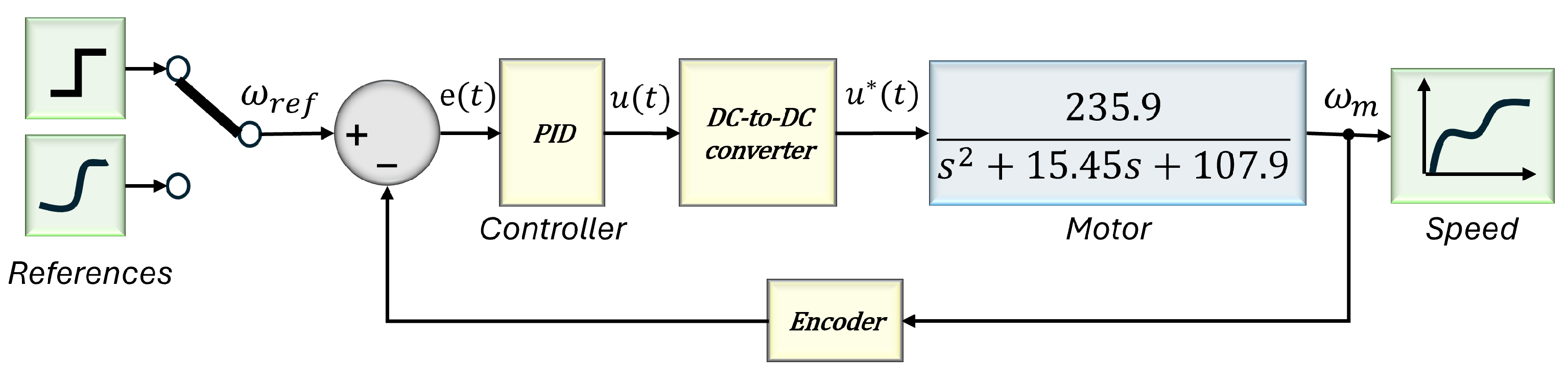 To evaluate the performance of the controller for speed tracking under smooth (Bézier curves) or stepped speed references, the closed-loop system was simulated, as shown in Figure 4. It is worth mentioning that the DC-to-DC converter stage is not included initially. Therefore, only a baseline is established for the motor speed and control signal (armature voltage). The complete stability analysis of the closed-loop system shown in Figure 4 is presented in Appendix A.