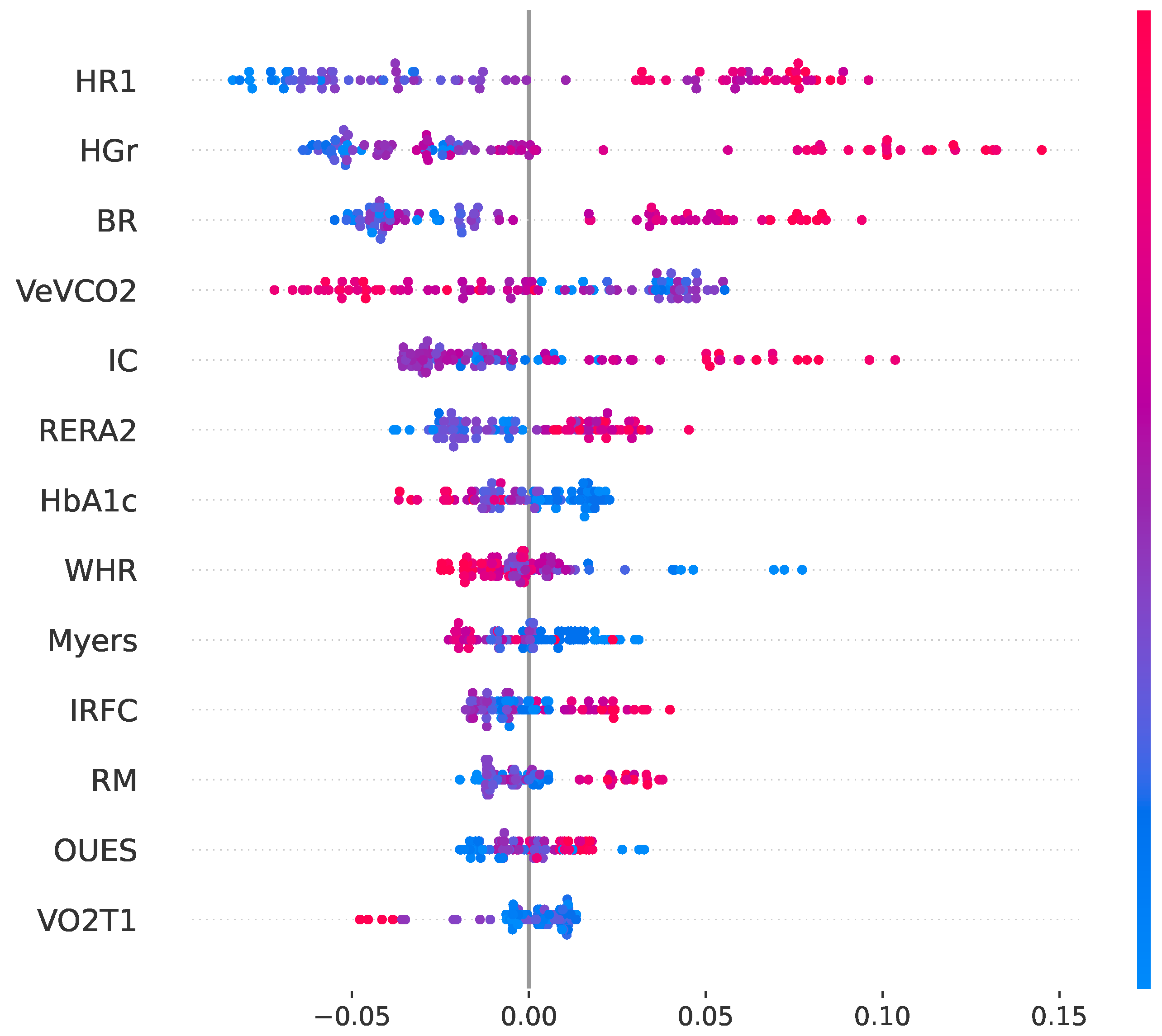 Based on the convergence aforementioned between the RF and SHAP rankings, a reduced space of characteristics was constructed using exclusively the predictors that appeared in the top-ranked list of both methods. This resulted in a compact set of 13 clinically meaningful baseline variables, which were: handgrip strength (HGr), heart rate at ventilatory threshold 1 (HR1), breathing reserve (BR), VE/VCO2 slope (VeVCO2), chronotropic index (IC), waist–hip ratio (WHR), respiratory exchange ratio at 2 min of recovery (RERA2), glycated hemoglobin (HbA1c), Myers functional exercise score (Myers), heart rate recovery index (IRFC), repetition maximum (RM), oxygen uptake efficiency slope (OUES), and VO2 at ventilatory threshold 1 (VO2T1). Interestingly, most of these predictors represent modifiable physiological targets, either through exercise training, intensity prescription, nutritional management or progression within the rehabilitation plan, which may support the translational relevance of using this reduced subset for clinical adjustment and individualized intervention simulation.