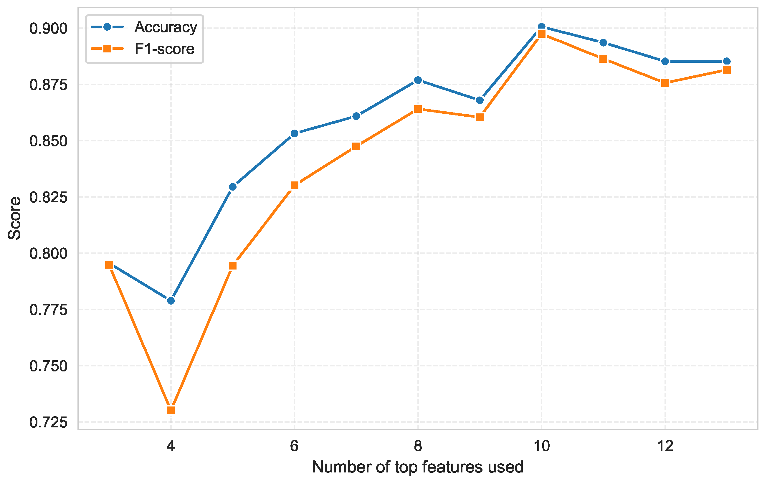 Although the RF–SHAP consensus set comprised 13 predictors, this subset was used as an intermediate candidate pool for further optimization rather than as the final model specification. Thus, while classification accuracy and F1-score dropped substantially when only 3–5 features were retained, a sharp performance gain was observed from 6 upward, reaching a clear maximum at 10 variables. Beyond this point, no further improvement was observed, confirming that the optimal trade-off between model complexity and performance is achieved with a limited number of predictors. Notably, using 11–13 predictors did not improve performance and even produced a slight decline, indicating that additional features introduce redundancy rather than additional discriminative value.