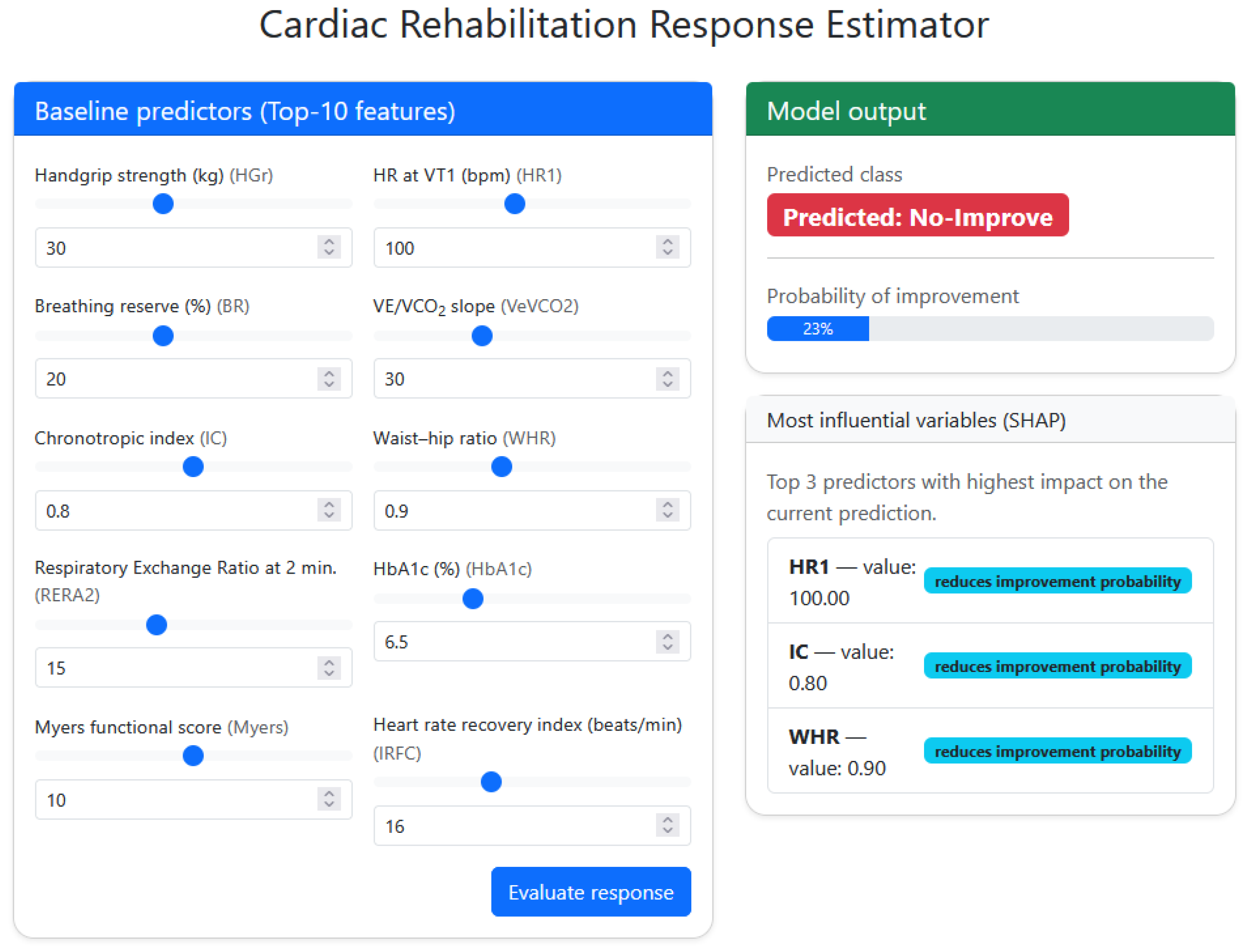 To facilitate the translational use of the proposed ML framework in routine clinical practice, a web-based prototype of a CDSS was developed. The application was implemented using a Python Flask backend connected to a lightweight HTML and Bootstrap frontend, and integrates directly with the final classification model derived from the feature importance and dimensionality reduction analyses. The backend exposes a set of endpoints that load the trained classifier and the corresponding preprocessing objects (e.g., Z-score normalizer), ensuring that the data transformation applied in the web tool is identical to that used during model training and validation. Clinicians can input or update baseline values for the selected modifiable predictors through an interactive interface composed of numeric fields and slider controls. Upon submission, the Flask server normalizes the inputs, feeds them into the final model, and returns the corresponding binary classification (responder vs non-responder). This design enables real-time estimation of the likelihood of achieving a clinically meaningful improvement in VO2peak for any new patient matching the inclusion profile of the cohort.