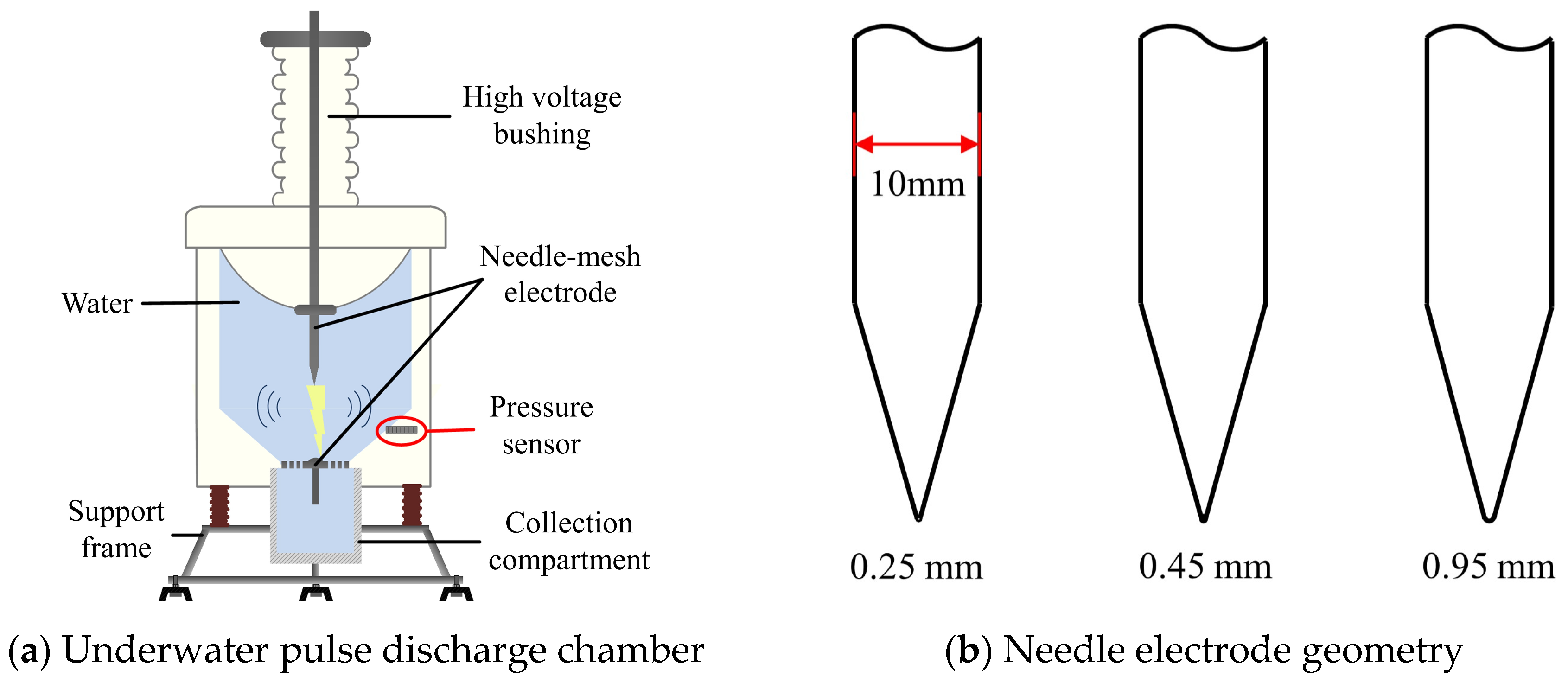 - Li, X.; Liu, Y.; Li, Z.; Zhou, G.; Zhang, Q.; Lin, F.; Pan, Y. Observation of Underwater Pulse Discharge and Influence of Deposited Energy on Shock Wave in Non-uniform Electric Field. Proc. Chin. Soc. Electr. Eng. 2017, 37, 3028–3036. [Google Scholar]