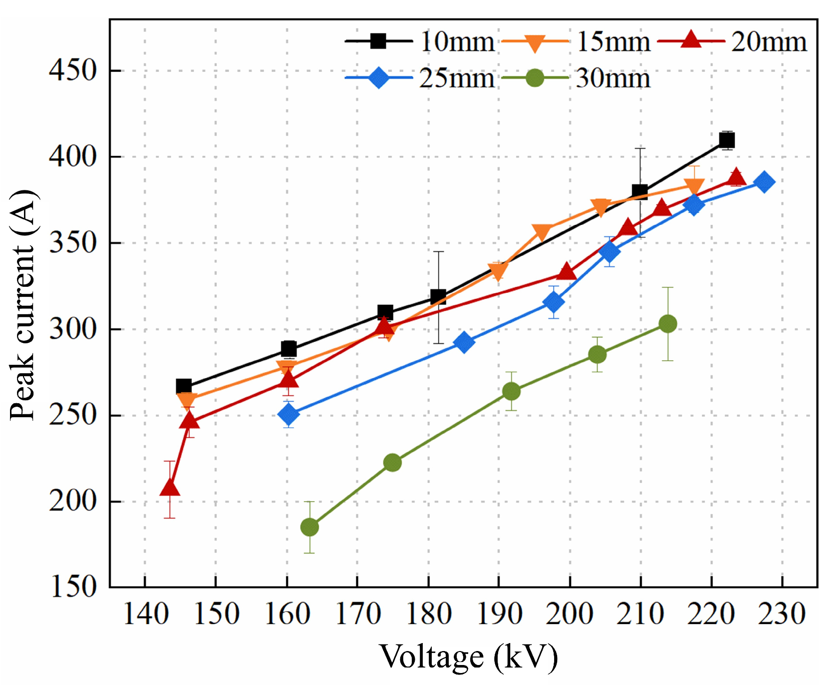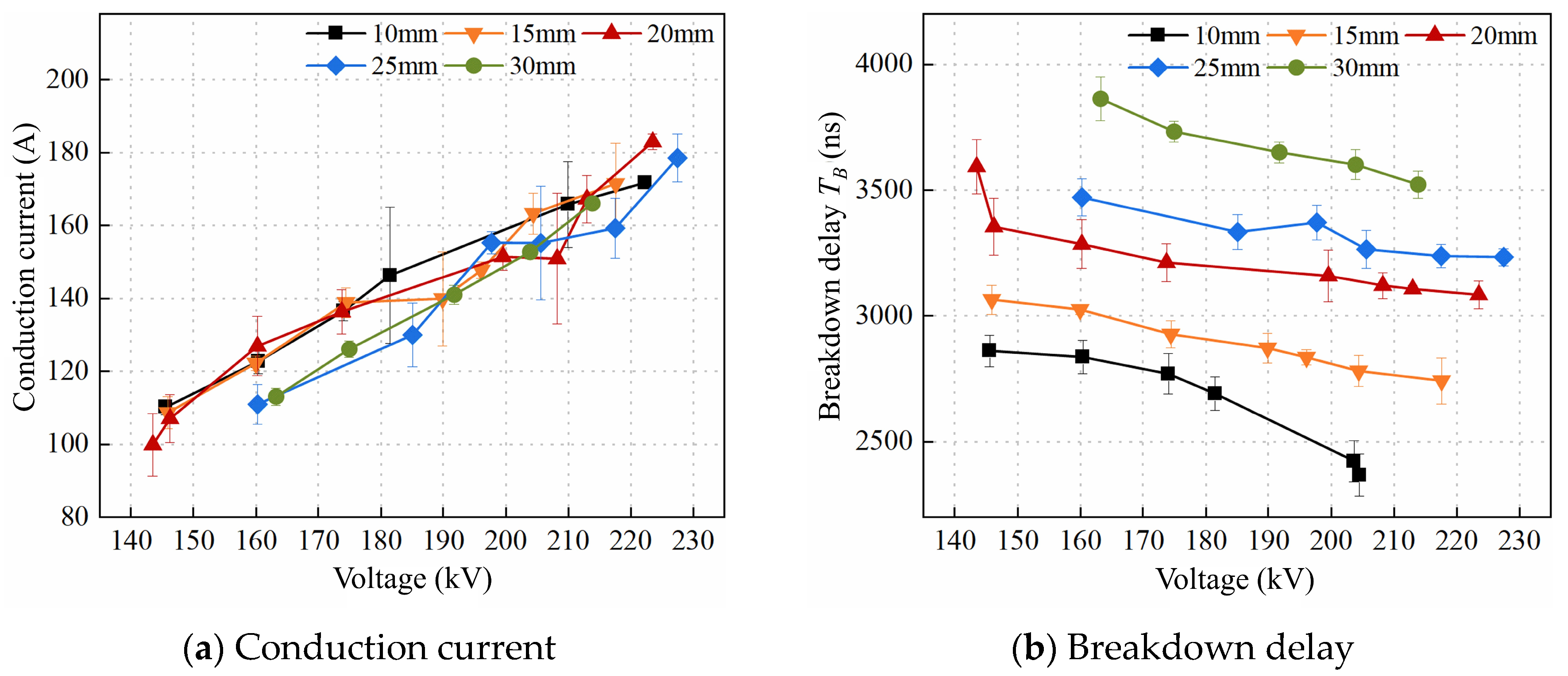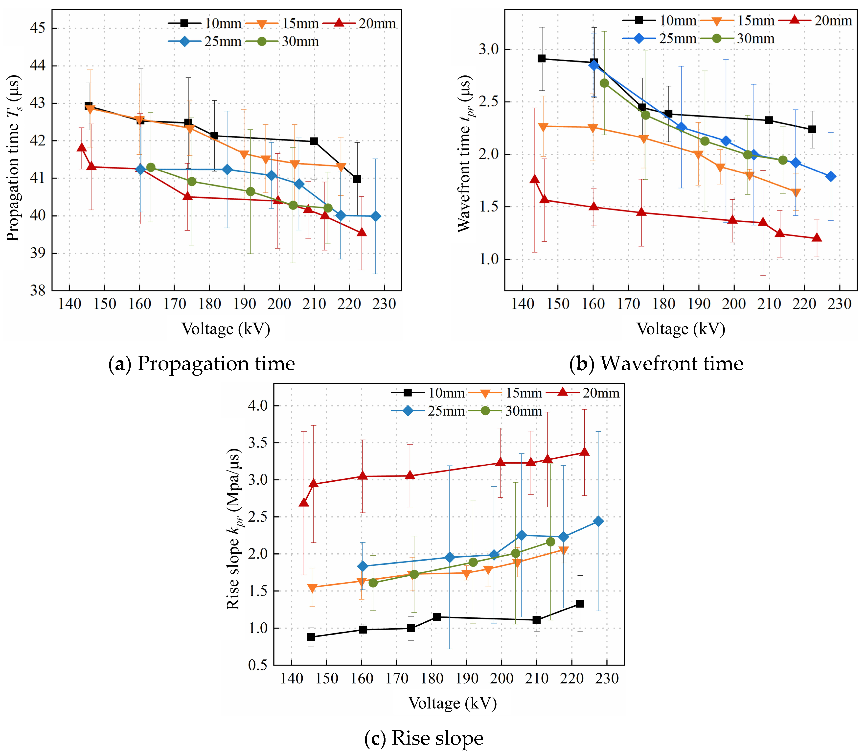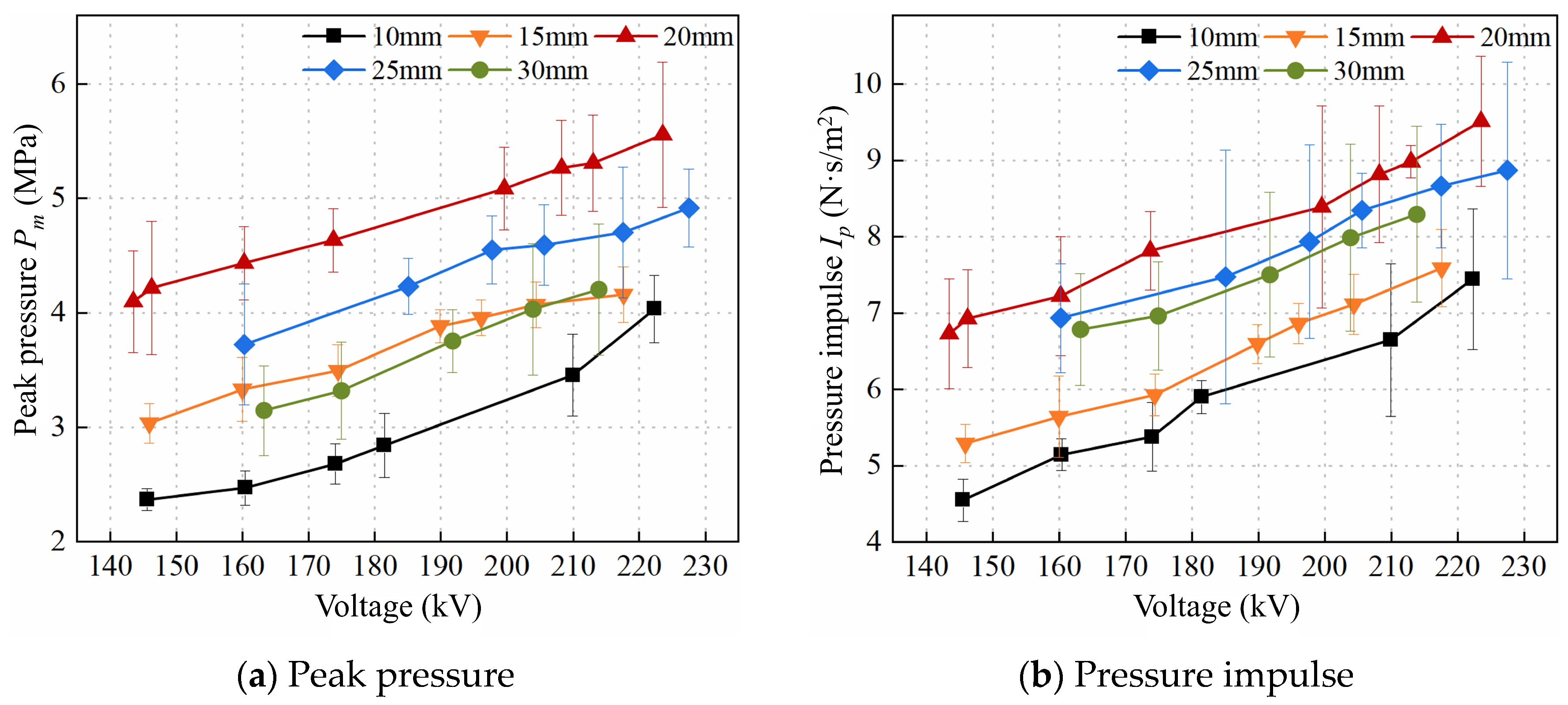 - As the electrode spacing increases, the extended propagation path of the streamer channel leads to a longer breakdown time delay and reduced breakdown efficiency. However, the equivalent resistance of the water gap also increases with larger spacing, which reduces the breakdown current and thereby decreases energy loss in the external circuit, improving the mechanical energy conversion efficiency. As a result, there exists an optimal electrode spacing that maximizes the energy converted into the shock wave. Under the conditions of this study, the optimal spacing is 20 mm, which corresponds to the highest equivalent wave velocity, the shortest wavefront time, and the steepest rise slope.