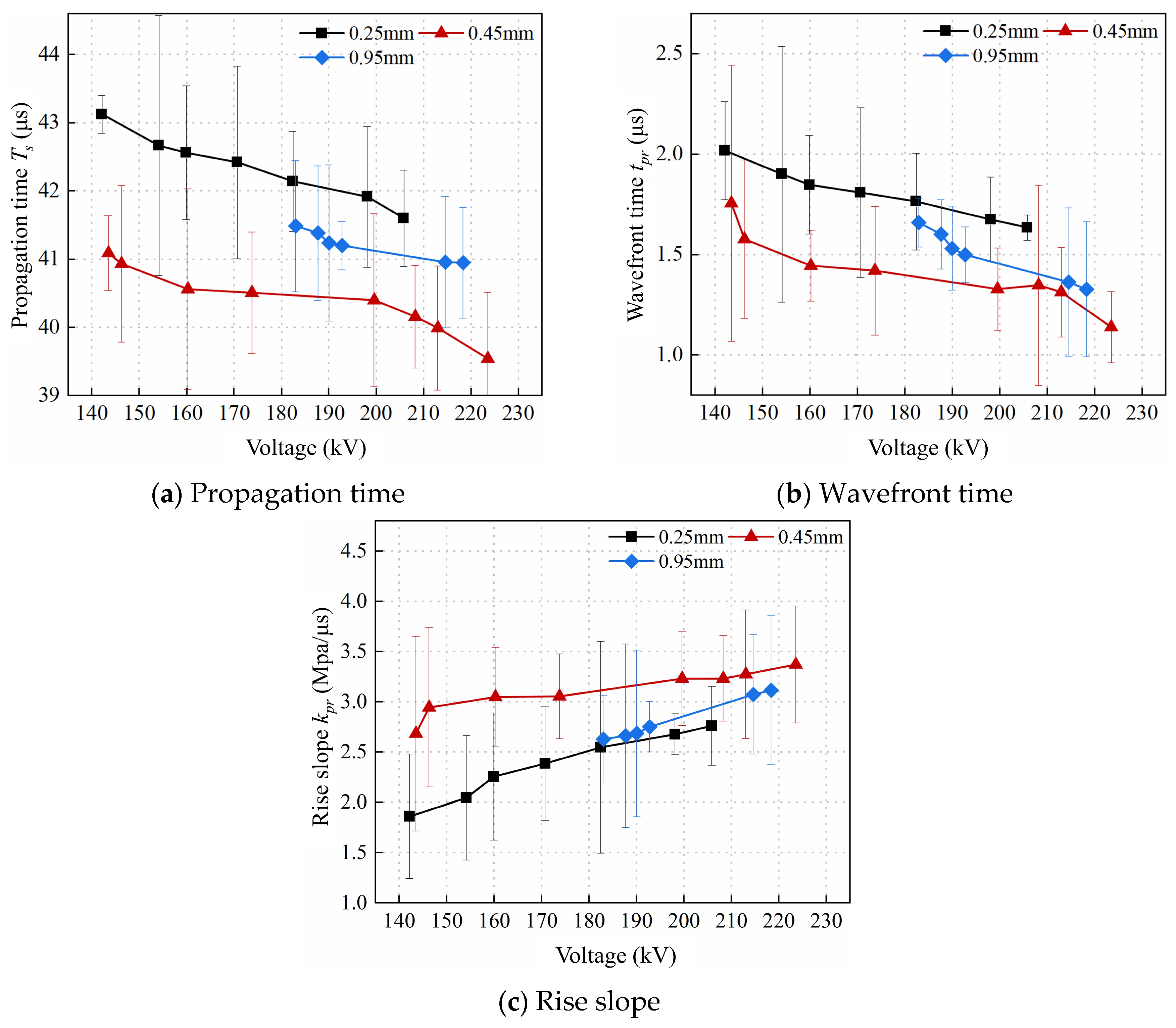 - A larger curvature radius reduces the electric field intensity at the electrode tip, slowing down the development of the streamer channel and increasing the breakdown time delay tB. On the other hand, the larger curvature radius enlarges the discharge channel radius and reduces the equivalent gap resistance, causing the conduction current to first decrease and then increase. The reduced electric field gradient also diminishes its attenuating effect on vaporization heating at the streamer head, increasing the energy input power. Therefore, the actual conversion efficiency first increases and then decreases with larger curvature radii. Under the experimental conditions herein, the 0.45 mm curvature radius yielded optimal performance, producing the highest shock wave intensity, equivalent wave velocity, and rise slope, along with the shortest wavefront time.