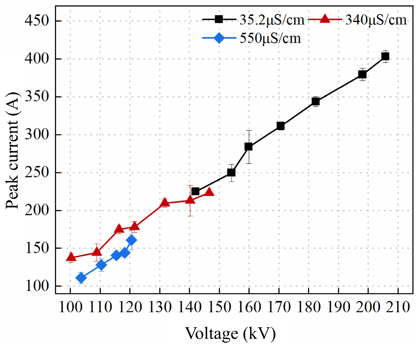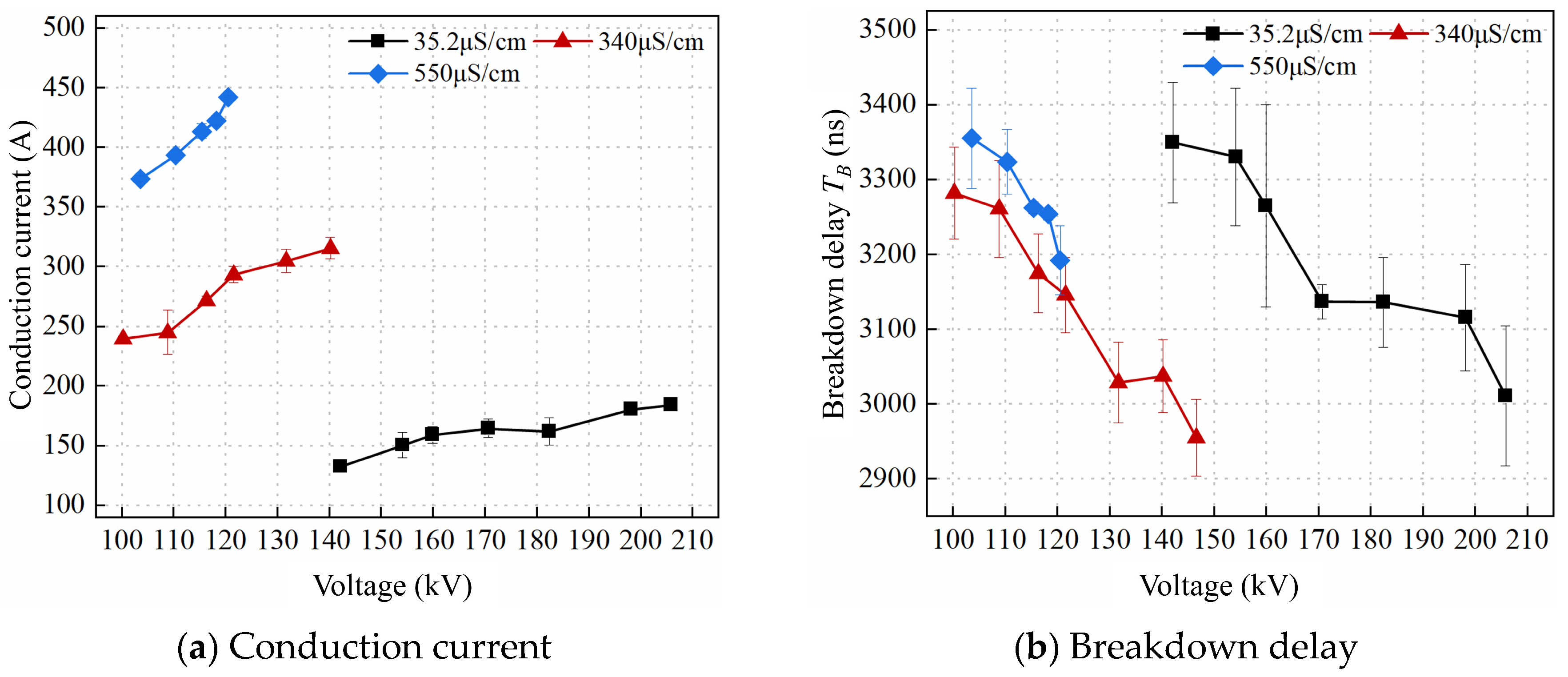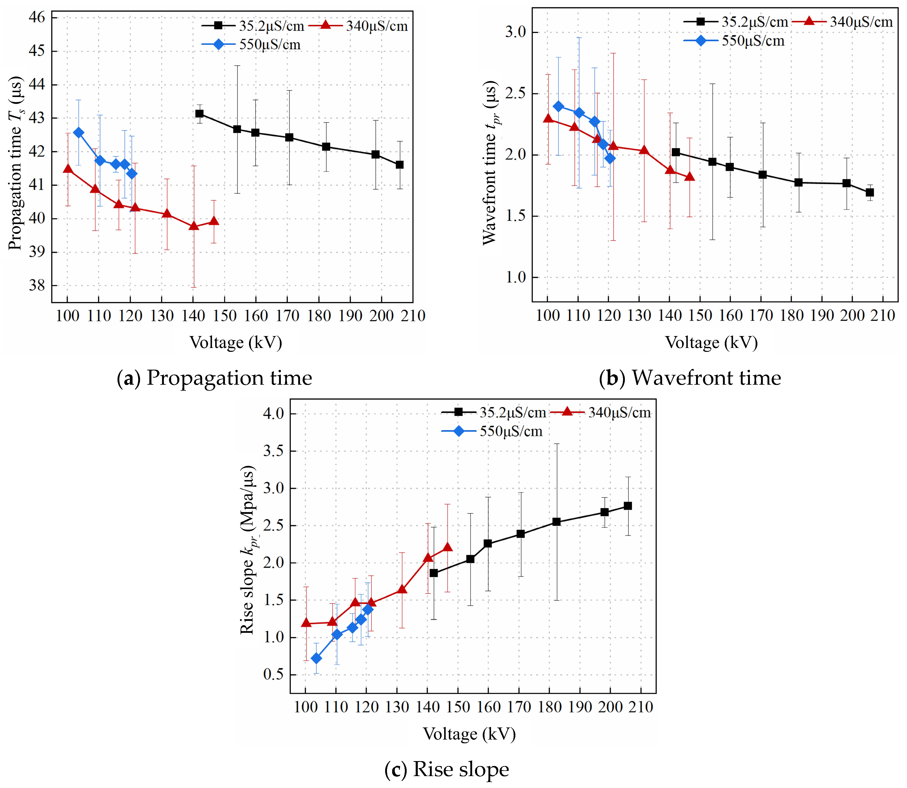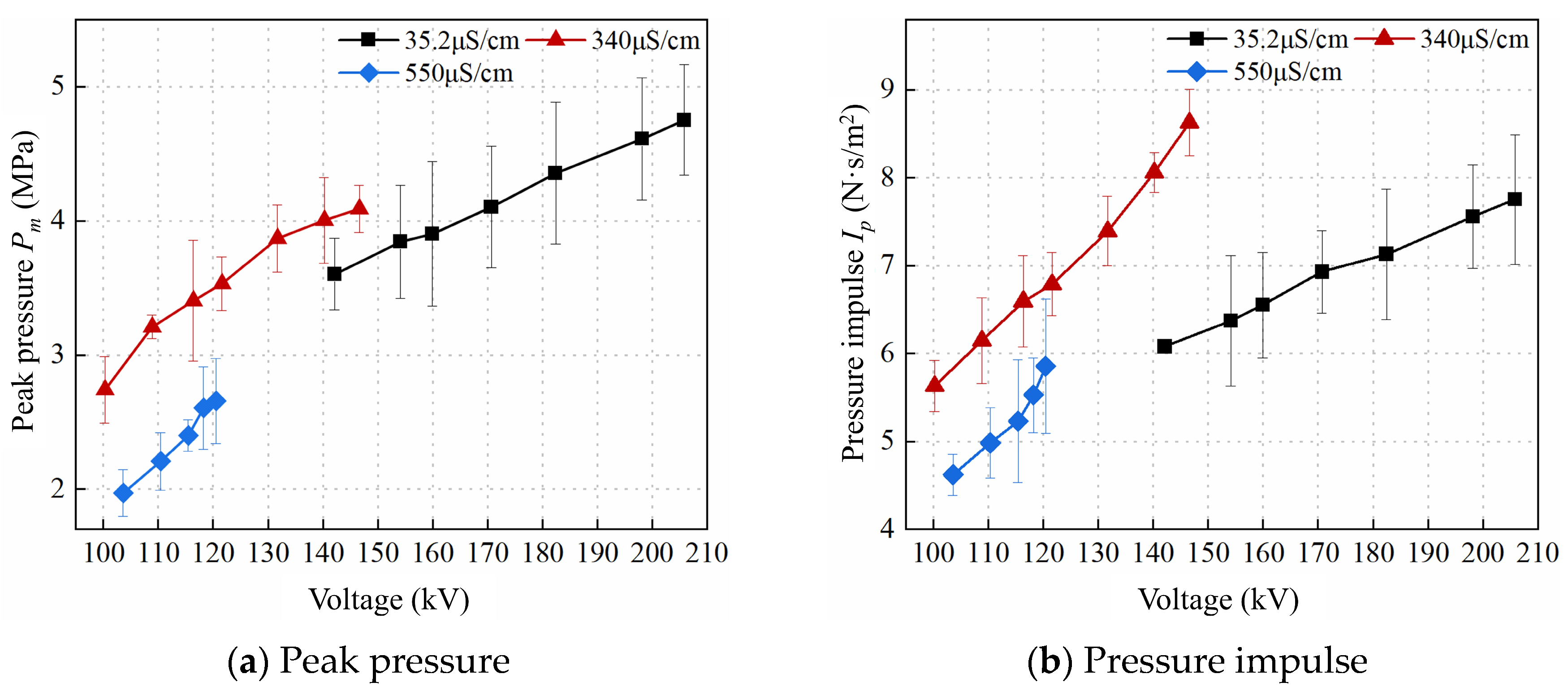 - When water conductivity increases within a moderate range, the elevated ionic current accelerates the vaporization and heating process of the water medium, promoting streamer propagation toward the ground electrode and reducing the breakdown time delay. In contrast, at higher conductivity levels, the conduction current in the gap increases significantly, leading to greater energy loss per unit time during streamer development. This weakens the electric field in the water gap, slows down streamer propagation, and increases the breakdown time delay. Hence, an optimal water conductivity exists that minimizes the breakdown time delay and maximizes the breakdown efficiency. In this study, a conductivity of 340 μS/cm resulted in the highest peak pressure, impulse, and equivalent wave velocity. Additionally, water conductivity had no significant influence on the rise slope or wavefront time.