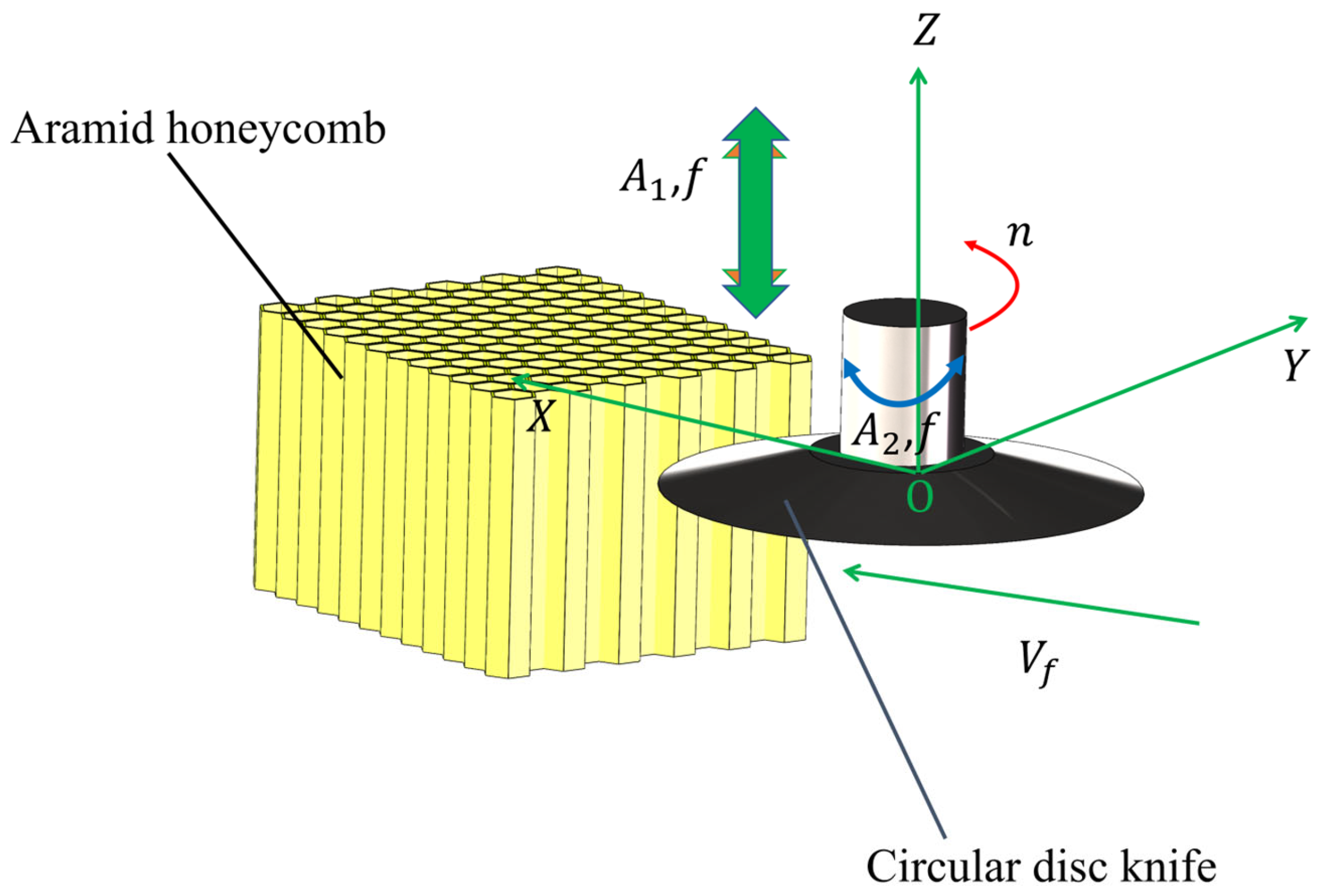 Although previous studies have confirmed that unidirectional ultrasonic vibration can effectively improve = cutting performance on aramid honeycomb, most of the existing work is limited to a single-dimensional vibration form, and there is relatively little research on multi-dimensional composite vibration in terms of reducing cutting force, suppressing cutting heat, and improving surface integrity. Specifically, for the longitudinal–torsional composite ultrasonic cutting method that simultaneously applies axial and torsional vibrations, its material removal mechanism, process rules, and advantages over traditional unidirectional vibration in the processing of aramid honeycomb have not been systematically and deeply studied. To fill this gap, this paper innovatively applies a longitudinal–torsional composite ultrasonic vibration system to aramid honeycomb cutting, adopting a research framework combining “mechanism modeling–simulation prediction–experimental verification” and, for the first time, systematically compares the differences in cutting force, cutting temperature, and surface quality between longitudinal–torsional composite vibration and unidirectional longitudinal vibration. The results of this study provide an innovative process scheme with clear mechanism support for the high-quality and efficient processing of aramid honeycomb.