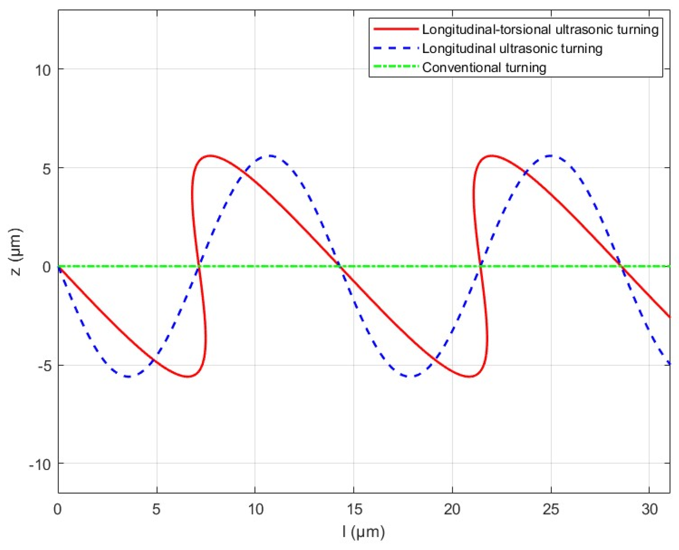The ordinary cutting trajectory and LUC and LTUC trajectories were compared; take r as 4.0 mm, A 1 as 5.6 μm, A 2 as 3.0 μm, f as 17.60 kHz, and n as 600 rpm, and the trajectory diagrams along the circumference of the tool (the l direction) are shown in Figure 2. Compared with the ordinary cutting trajectory, in the LTUC trajectory, the trajectory of the cutting edge not only vibrates at high frequency in the Z direction but also shows a rotational phenomenon. This phenomenon is due to the torsional vibration of the cutting tool at the same frequency as the longitudinal vibration during the cutting process. Due to the addition of torsional vibration, the cutting tool can not only make periodic contact and separation with the workpiece along the tool axis but can also achieve periodic contact and separation with the workpiece in the feed direction.