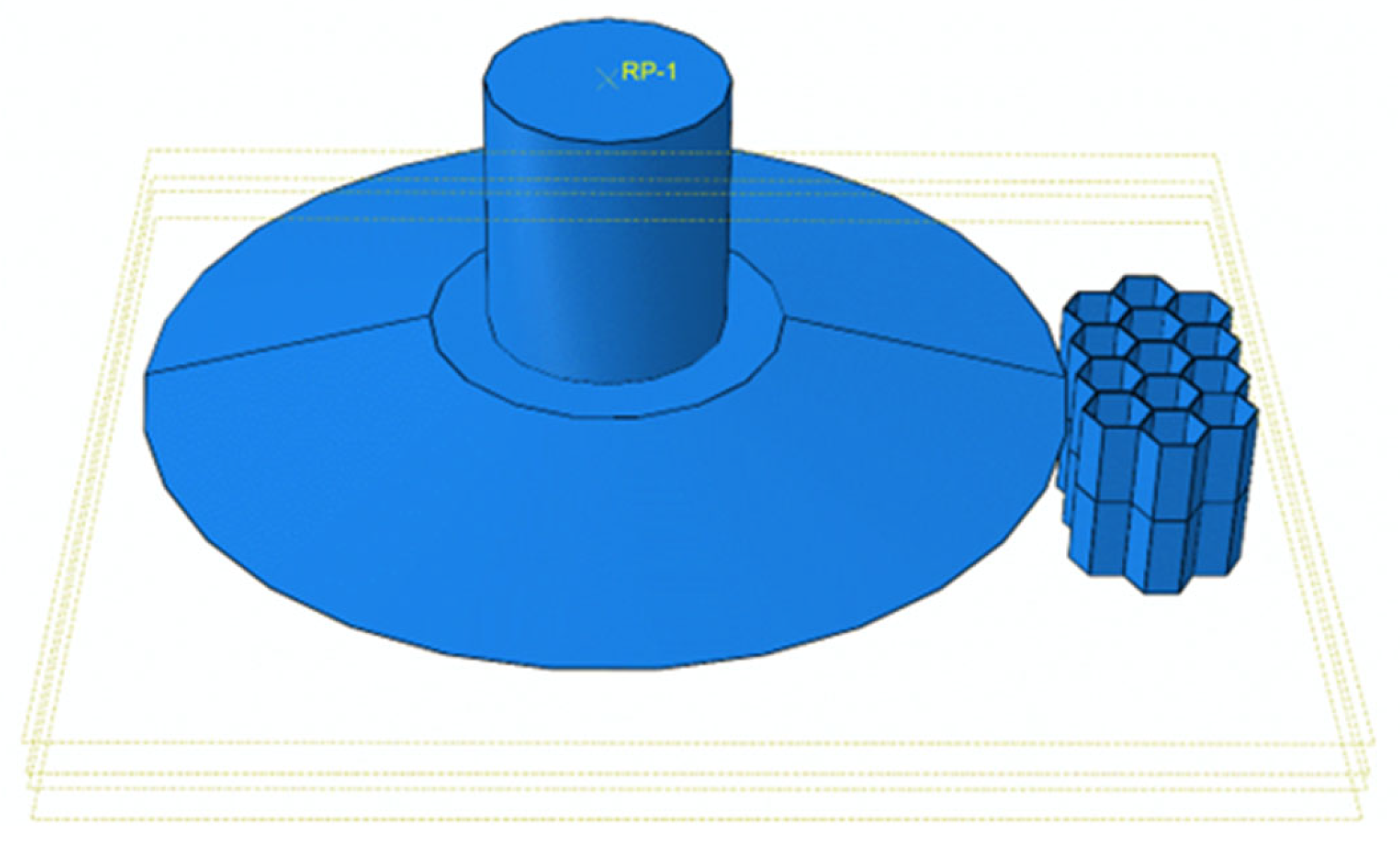 The cutting tools used in the fine processing of aramid honeycomb materials are circular cutters, which are quite different from traditional cutting tools. In order to make the simulation environment close to the real processing environment, modeling is carried out in 3D drawing software based on the geometric parameters of the actual cutting processing tools and the structural dimensions of the aramid honeycomb, and assembly is completed. The assembled model was imported through the preprocessing page of the finite element simulation software, as shown in Figure 3. The parameters of the aramid honeycomb and the geometric parameters of the cutting tool are presented in Table 1 and Table 2.