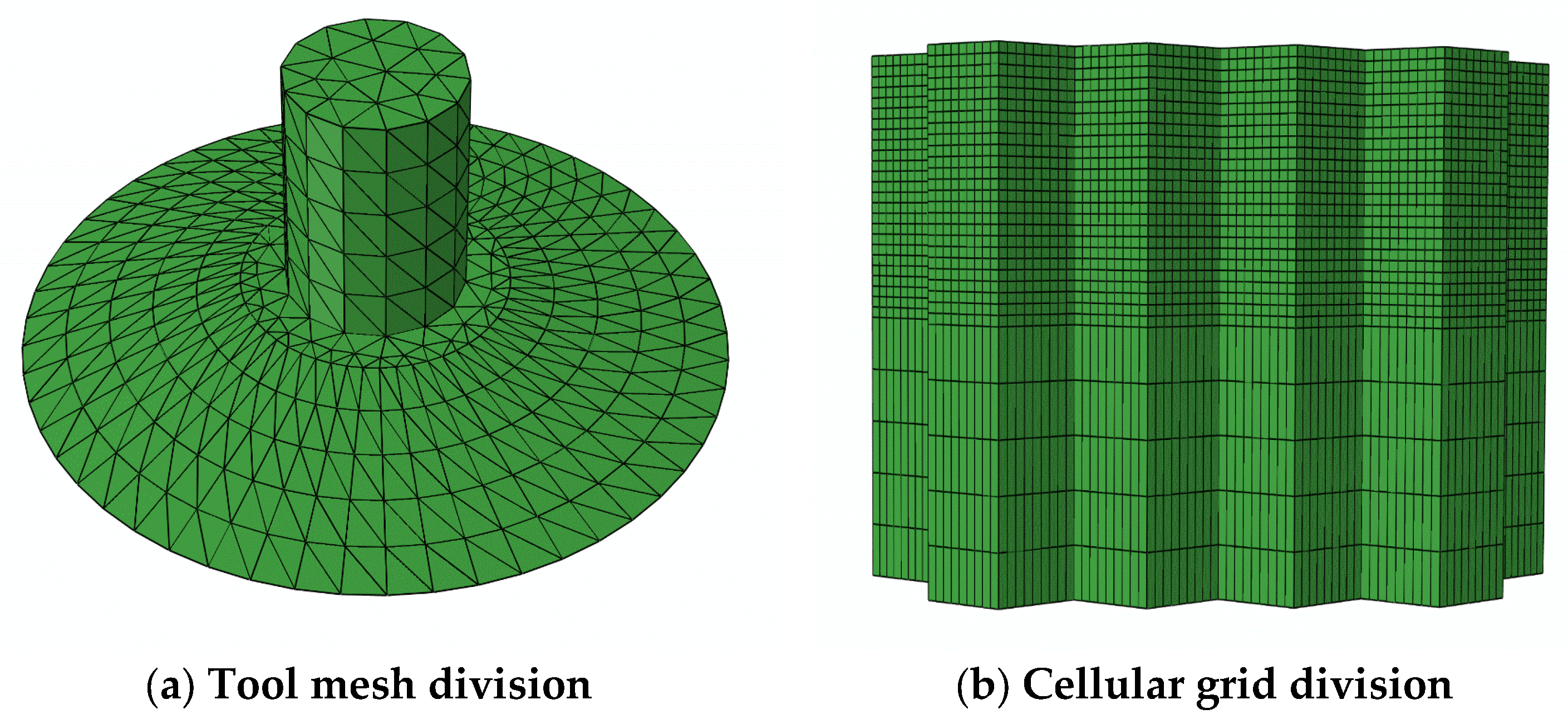 When conducting finite element simulations, the meshing step is of vital importance, as it directly affects the accuracy of the simulation results. In the finite element simulation software, the methods for dividing solid elements include the structured mesh partitioning method, the swept mesh partitioning method and the free mesh partitioning method. The structured mesh division of the finite element simulation software has the characteristics of regularity and high precision. The aramid honeycomb material has a regular shape, so the hexahedral element structured mesh division method is adopted. The honeycomb mesh is a C3D8T eight-node hexahedral mesh. The geometric shape of the cutting tool is rather complex, and its hardness is much greater than that of honeycomb materials. The cutting tool can be regarded as a rigid body. When configuring the grid properties, the free grid division method is selected, and the cutting tool grid is a C3D10MT ten-node tetrahedral element grid.