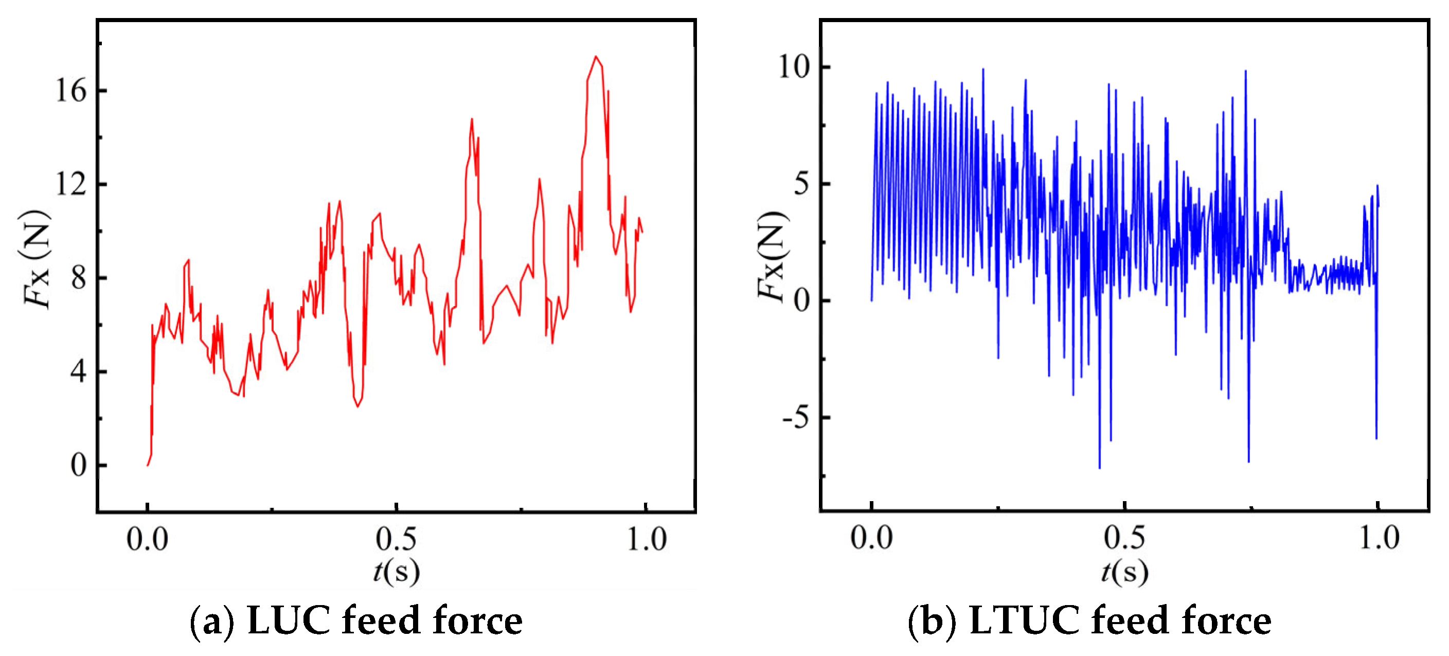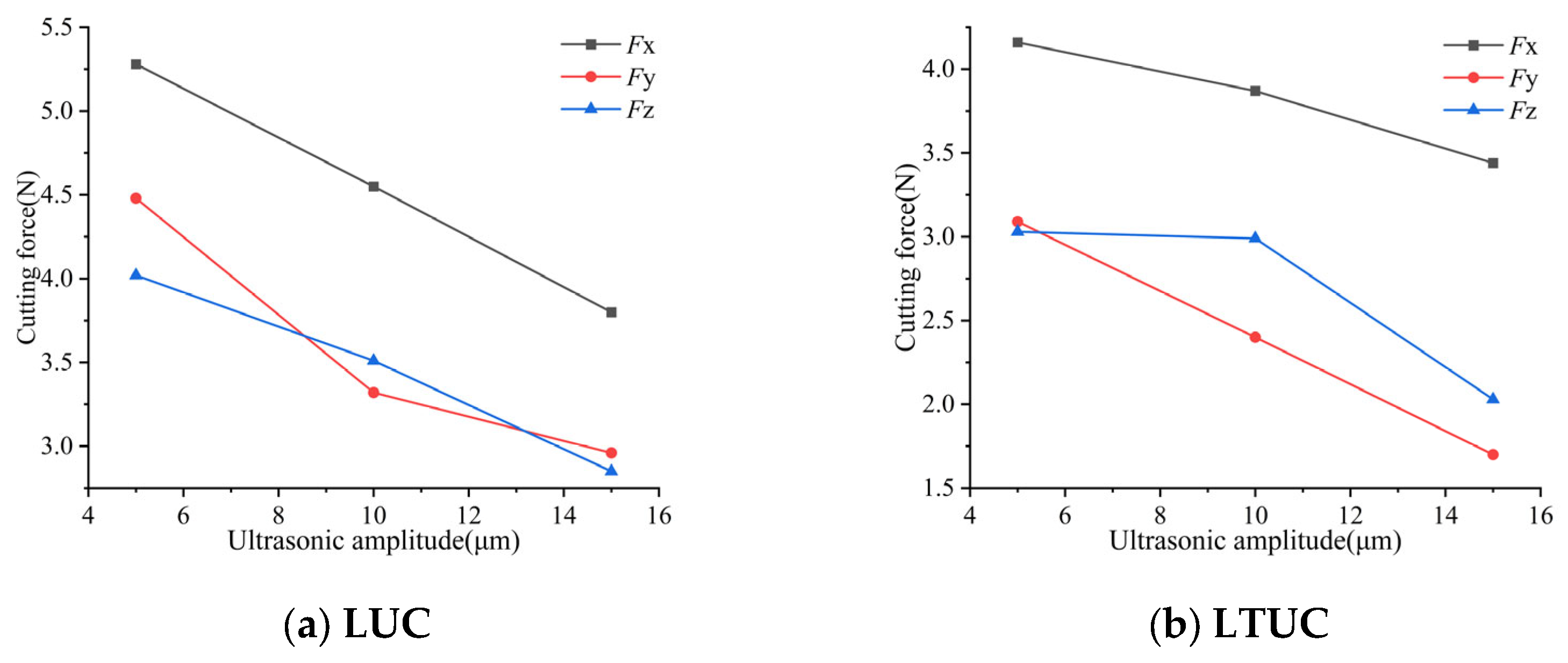It can be seen from Figure 16 that the ultrasonic amplitude increased from 5 μm to 15 μm. The feed force of LUC decreased from 5.28 N to 3.80 N, with a decrease of 28%; the tangential force of LUC decreased from 4.48 N to 2.96 N, with a decrease of 34%; and the axial force of LUC decreased from 4.02 N to 2.85 N. The reduction rate reached 29%. The feed force of LTUC decreased from 4.16 N to 3.44 N, with a reduction of 17%. The tangential force of LTUC decreased from 3.09 N to 1.70 N, with a reduction of 45%. The axial force of LTUC decreased from 3.03 N to 2.03 N, with a reduction of 33%. With an increase in ultrasonic amplitude, the three-directional cutting force shows a downward trend, which is consistent with the trend of simulated cutting. The variation amplitude of the three-directional cutting force is more obvious compared with the spindle speed and feed rate.