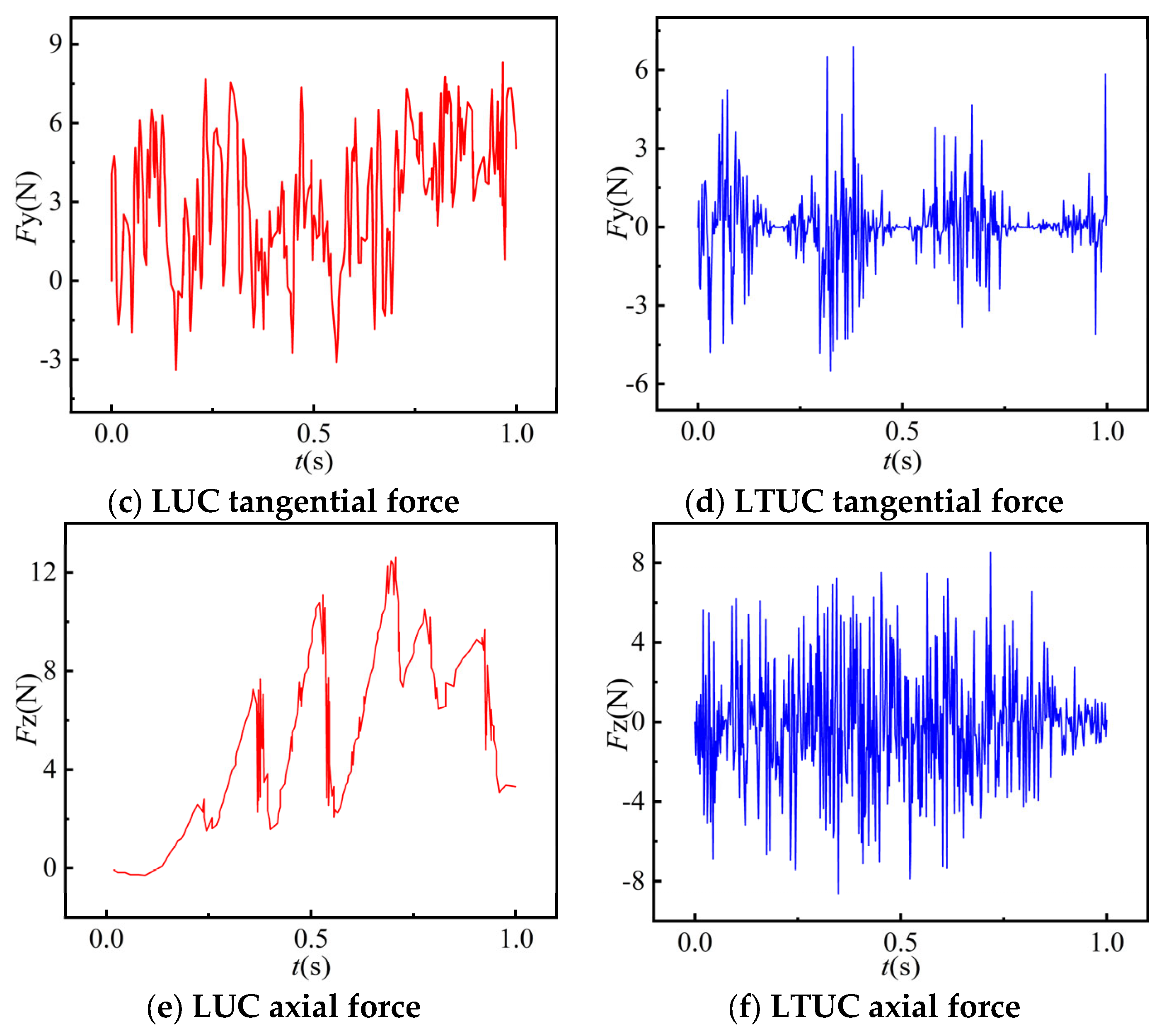 According to the cutting parameters in Table 4, it can be seen from Figure 6 that the average feed force for the LUC of aramid honeycomb is 8.32 N, the average tangential force is 2.64 N, and the average axial force is 5.61 N. The average feed force of aramid honeycomb during LTUC is 5.97 N, the average tangential force is 1.43 N, and the average axial force is 3.86 N. Compared with LUC, the three-directional cutting forces in LTUC have decreased significantly. The feed force has decreased by an average of 28.2%, the tangential force has decreased by an average of 45.8%, and the axial force has decreased by an average of 31.2%. LTUC has a more obvious effect on improving the cutting force compared with LUC.