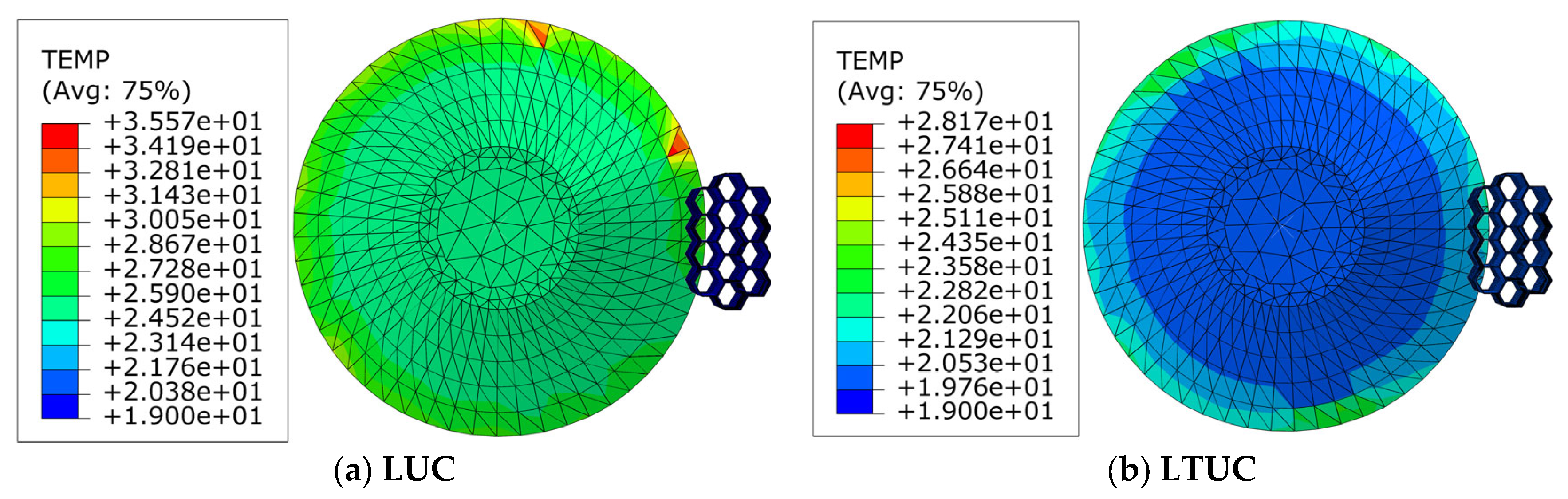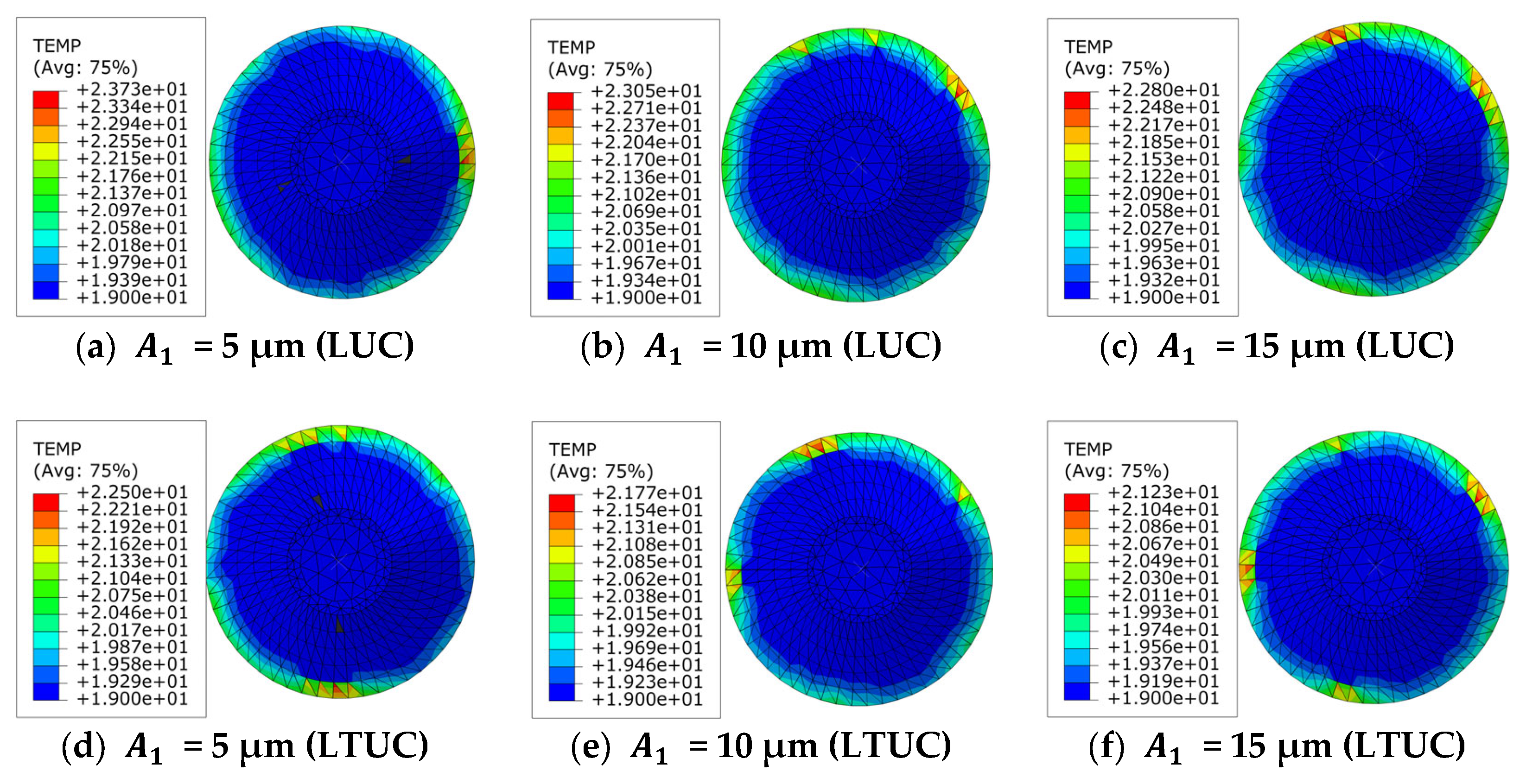 Figure 7 shows a temperature cloud graph at the moment when the highest temperature occurs in the longitudinal and LTUC simulation of the tool. The highest temperature of the tool under LUC is 35.5 °C (local peak temperature), while that under LTUC is 28.17 °C (local peak temperature). Compared with LUC, the tool temperature under LTUC decreases by 21%. The main reason is that during the LTUC process, due to the existence of torsional vibration, the tool will also have periodic contact and separation with the aramid honeycomb in the feed direction. The contact time between the tool and the workpiece is reduced compared to the LUC time, which is equivalent to an additional heat dissipation process, and the frictional heat is naturally reduced.