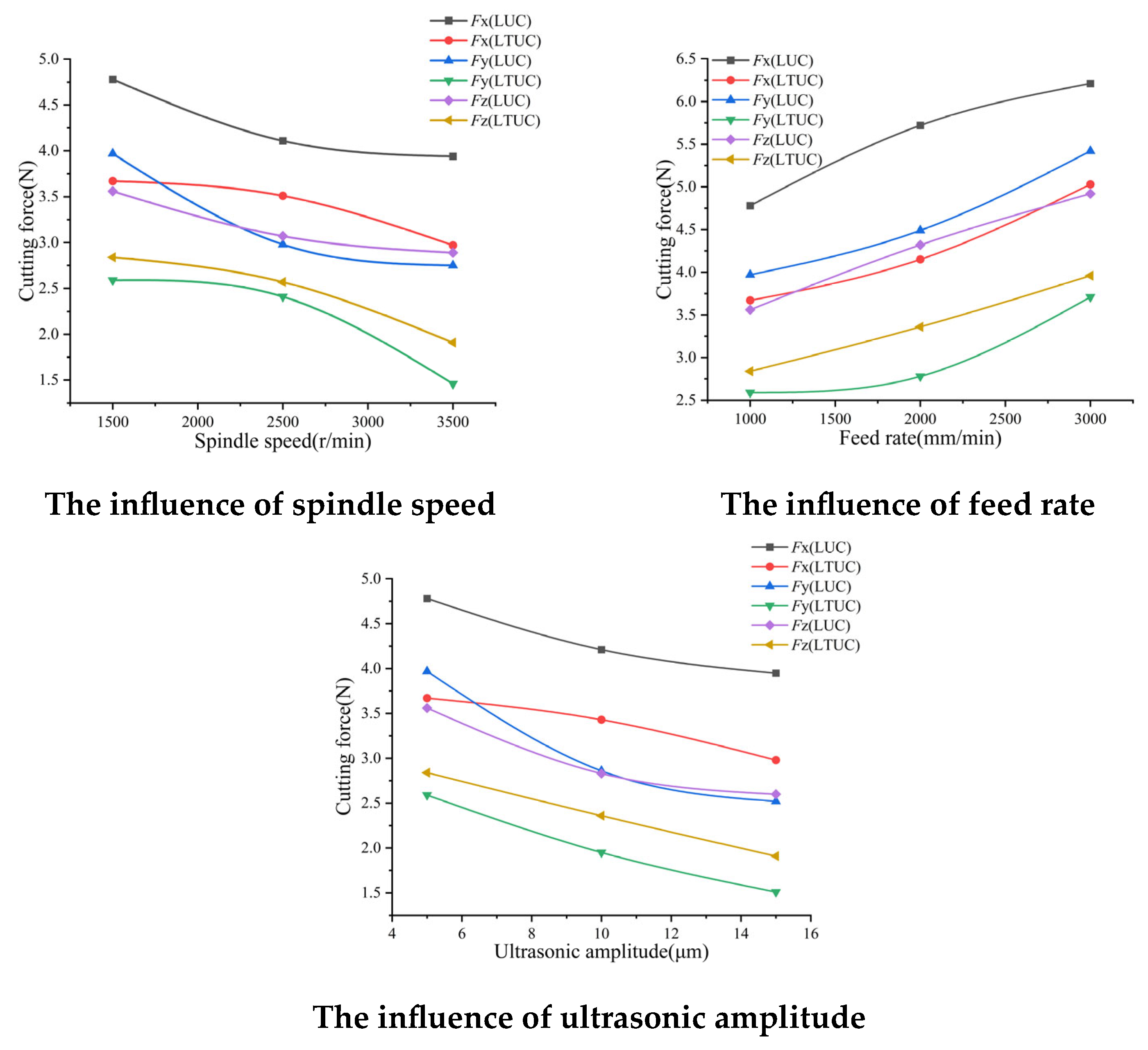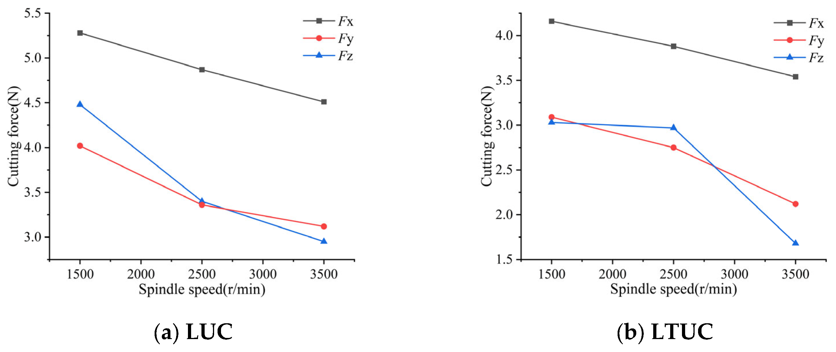 Under the condition that the feed rate and ultrasonic amplitude remain the same, only the spindle speed is set at 1500 r/min, 2500 r/min, and 3500 r/min to study the influence of the spindle speed on the cutting force and tool cutting temperature under the two processing methods of LTUC and LUC. The experimental parameters are shown in Table 5.