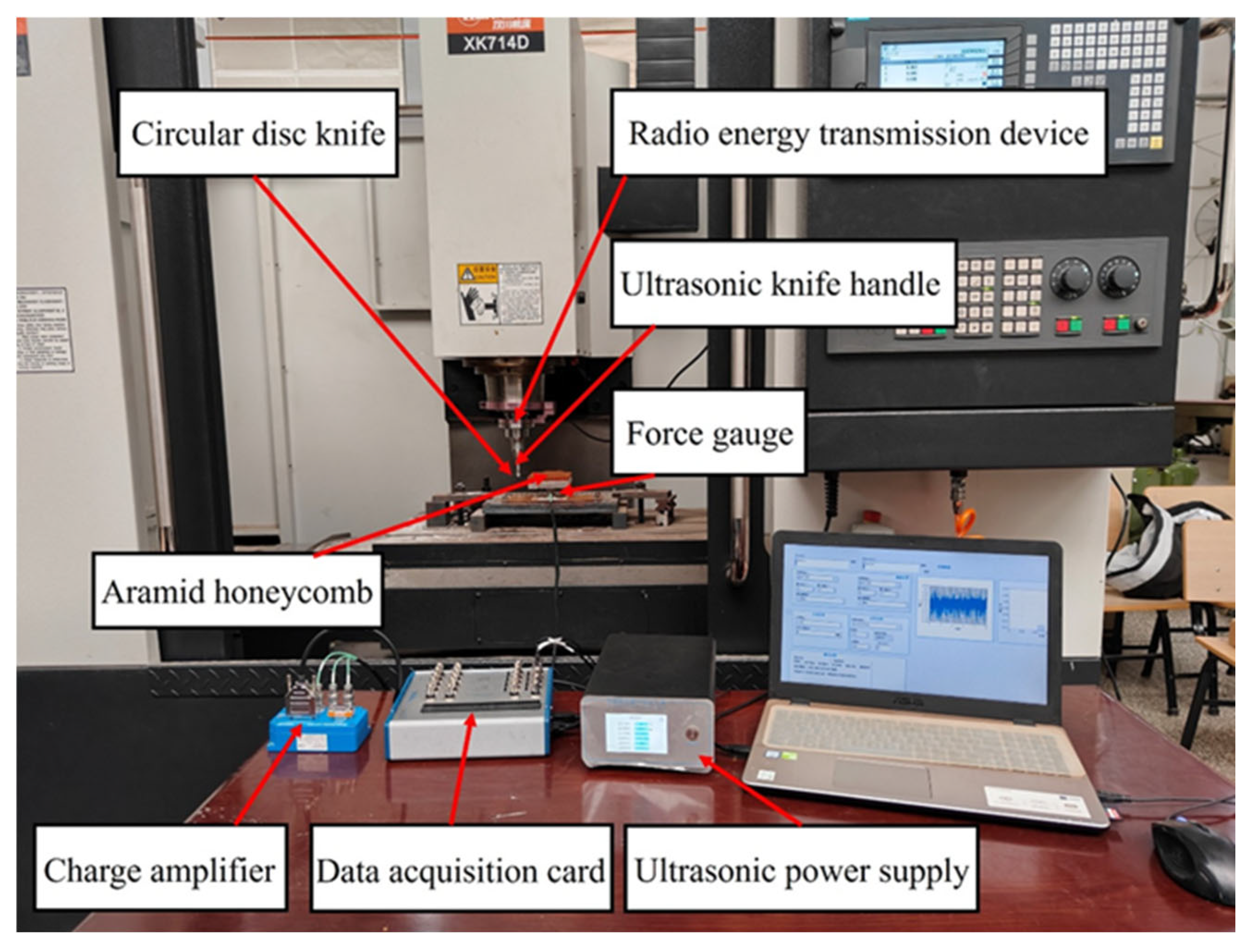 The test was conducted based on the ultrasonic processing test platform built in the laboratory, and the test setup is shown in Figure 12 and Figure 13. It is mainly composed of ultrasonic transducers, amplitude transformers, machine tool spindles and rotary cutters. The materials of the disc cutter and the workpiece are the same as those in the simulation. Before the test, the amplitude of the circular cutter was measured using the Keyence LK-G10 laser displacement sensor. Since the vibration sources of longitudinal waves and transverse waves are the same, they have the same vibration frequency. The ultrasonic vibration parameters of the circular disc cutter can be obtained through the laser displacement sensor and simulation calculation, as shown in Table 8. The cutting parameters were the same as the simulation parameters. By means of comparative tests, LUC and LTUC tests were conducted successively with two identical tools. The cutting force was measured by the Kistler (Switzerland) 9317C three-component force sensor, which simultaneously recorded the three perpendicular components: the thrust force (Fx), the tangential force (Fy), and the axial force (Fz). The data was amplified by the Kistler 5073A411 charge amplifier and collected through the NI-USB-6346 data acquisition card. The cutting morphology of the aramid honeycomb and the tool wear were observed using the DVM-4K-3000 series microscope produced by Mega Instruments (Suzhou, China).