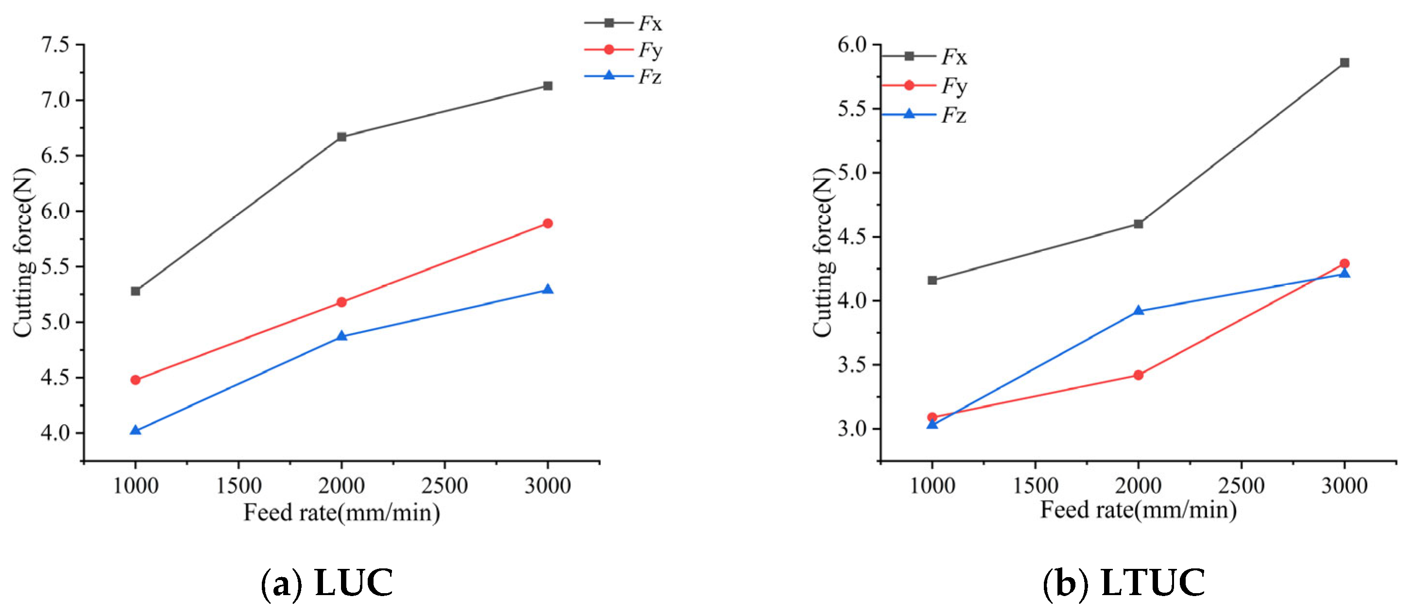 It can be intuitively seen from Figure 15 that during the process, when the feed rate increases from 1000 mm/min to 3000 mm/min, under the condition that other parameters are the same, the three-directional cutting force of the LTUC of aramid honeycomb is always less than that of LUC, and with an increase in the feed rate, the cutting forces of both processing methods show an upward trend. From 1000 mm/min to 3000 mm/min, the feed force of LUC increased from 5.28 N to 7.13 N, with an increase of 35%. The tangential force of LUC increased from 4.48 N to 5.89 N, with an increase of 34%. The axial force of LUC increased from 4.02 N to 5.29 N. The increase reached 32%. The feed force of LTUC increased from 4.16 N to 5.86 N, with an increase of 41%. The tangential force of LTUC increased from 3.09 N to 4.29 N, with an increase of 39%. The axial force of LTUC increased from 3.03 N to 4.21 N, with an increase of 39%. The trend of the experimental results is consistent with the simulation. An increase in the feed rate will lead to an increase in the three-directional cutting force, but the variation amplitude of the cutting force is not as obvious as that of the spindle speed. Moreover, during the machining process, using a smaller feed rate can effectively control the magnitude of the cutting force.