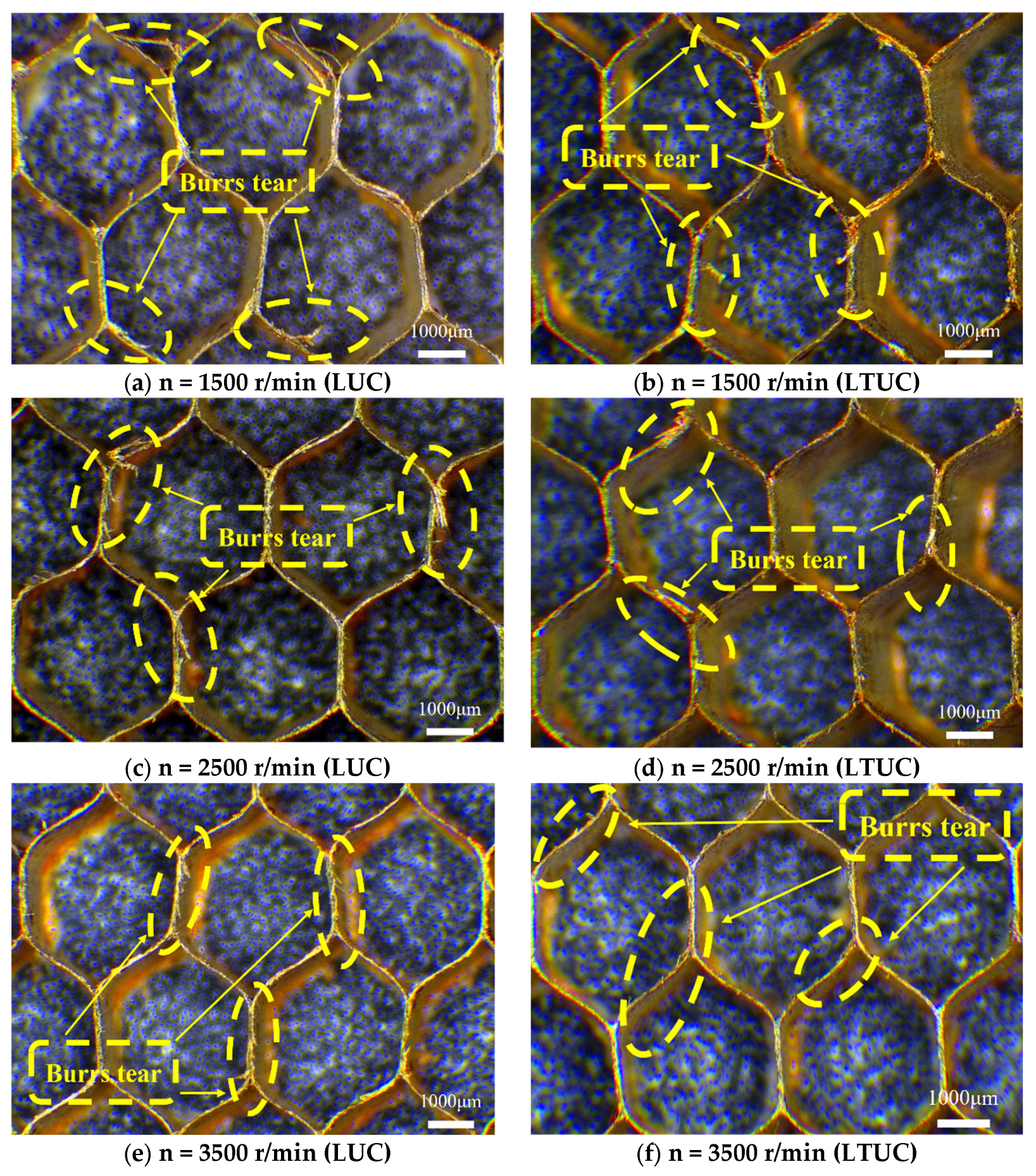 Figure 17 shows the surface morphology of aramid honeycomb processed by longitudinal cutting and LTUC at different spindle speeds. When the spindle speed is lower, the surface morphology of both processing methods shows relatively obvious burr tearing phenomena. However, as the spindle speed increases, the burr tearing deformation decreases, and the surface morphology of aramid honeycomb after cutting becomes flatter, and the surface processing quality is better. By comparing the surface morphology of aramid honeycomb under longitudinal cutting and LTUC, it is found that the surface morphology of aramid honeycomb under longitudinal torsion ultrasonic cutting has smaller burrs and tears, a smoother surface morphology, and better surface quality.