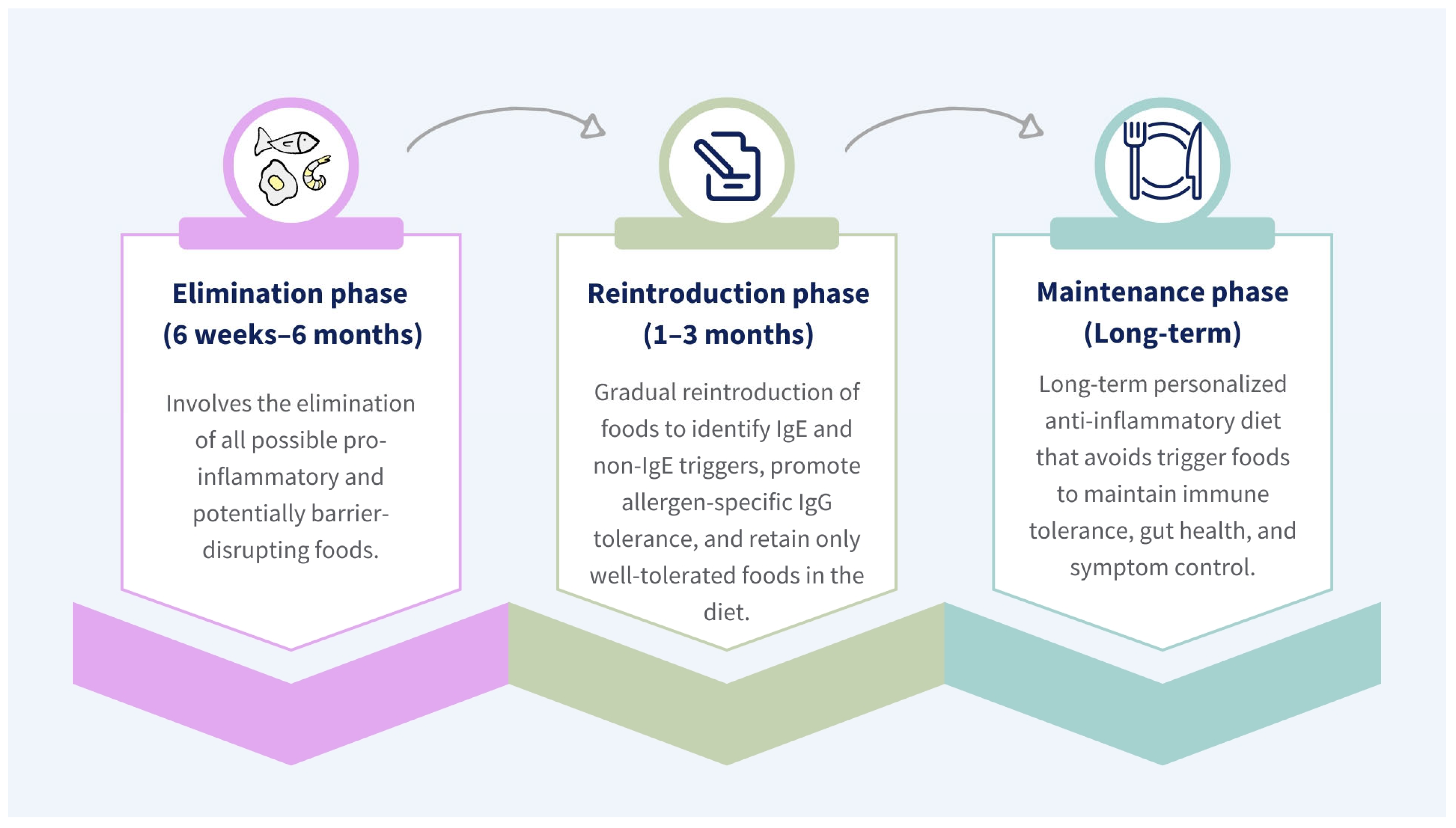 | Reintroduction | Symptom-guided | Gradual reintroduction of eliminated foods | Identify individual IgE- and non-IgE triggers, promote allergen-specific IgG (“blocking antibodies”), monitor barrier and immune recovery | Personalized allergen identification, improved tolerance, reduced risk of new sensitizations |