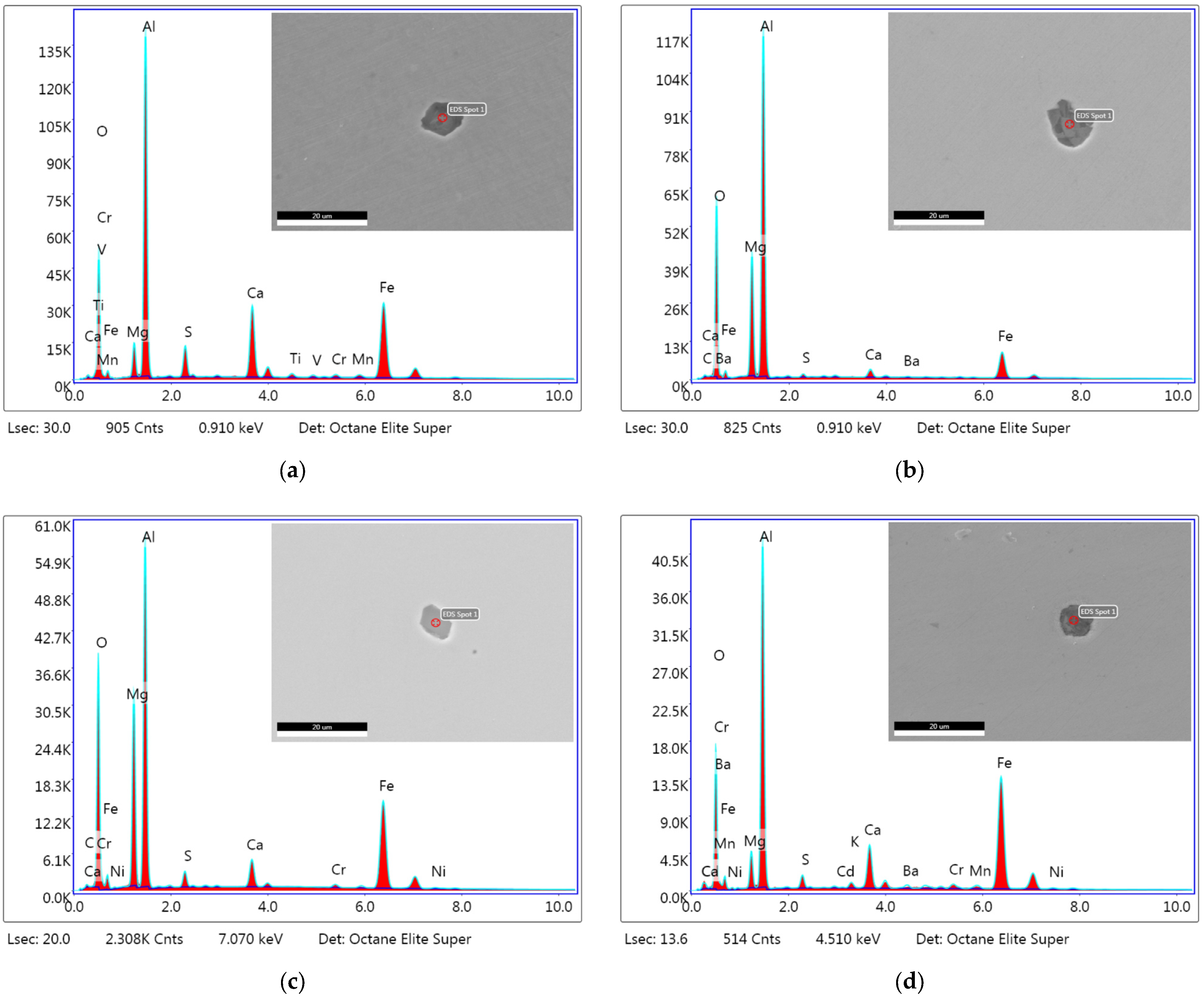 - Zheng, D.; Ma, G.; Zhang, X.; Li, M.; Li, Z. Evolution of MnS and MgO·Al2O3 inclusions in AISI M35 steel during electroslag remelting. J. Iron Steel Res. Int. 2021, 28, 1605–1616. [Google Scholar] [CrossRef]