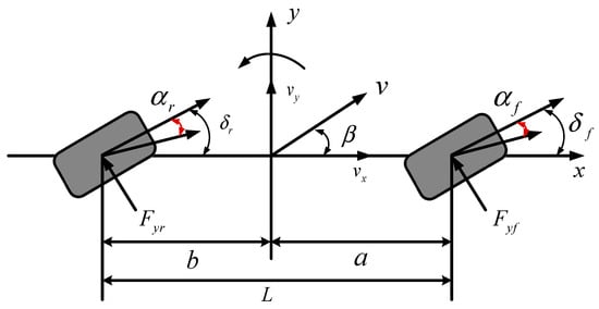 In Equations (1)–(3), and represent the front and rear lateral deviation forces, and are the cornering stiffnesses of the front and rear wheels, and are the longitudinal and lateral speed.