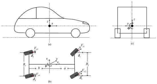 All vehicle dynamics equations are established in the standard body-fixed coordinate system (ISO 8855), with the origin at the center of gravity, x-axis pointing forward, y-axis to the left, and z-axis upward [24,25].