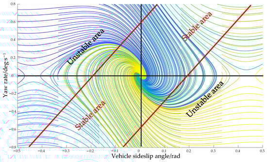 Therefore, considering the two state variables of the vehicle comprehensively, the phase plane is selected to establish a dual parameter cooperative criterion for accurate identification of the stability boundary, and the double line method is introduced to divide the stable region. The specific approach is shown in Figure 6.