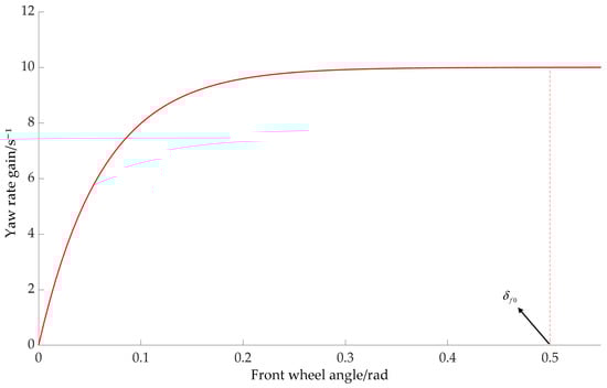 The boundary between the 4WS and 4WS + DYC regions is determined by the yaw rate gain. The relationship between the yaw rate gain and the front-wheel steering angle is , as shown in Figure 8. When is stable, it means that the lateral force of the tire is in the linear working area, and the 4WS system can achieve the expected stability control independently. When deviates from the stable value with the increase in the front-wheel steering angle, it indicates that the tire is approaching or entering the nonlinear zone, and 4WS control can no longer meet the demand.