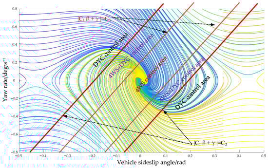 According to the control characteristics of the 4WS system and the DYC system, the lateral force of tires tends to saturation, and both front and rear wheels have steering angle limits due to mechanical structure constraints and tire physical properties. Specifically, the rear-wheel steering angle, as an additional control input of the 4WS system, usually has a stricter steering threshold to avoid exceeding the tire linear slip region. Moreover, the optimal working range of the 4WS system is in the region where the tire slip characteristics are linear. Therefore, to prevent the 4WS system from destabilizing the vehicle by forcing the tires into their nonlinear range or reaching steering limits, the control strategy is divided into three regions based on vehicle stability: the stable region (controlled by 4WS), the unstable region (controlled by DYC), and the transition region (coordinated control by 4WS + DYC).