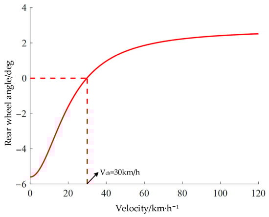 Based on the control region partitioning in Figure 9, it is necessary to develop reasonable switching rules for the integrated 4WS/DYC across different regions. Furthermore, within a single control region, a dynamic allocation of control weights between the 4WS and DYC systems must be achieved. To simultaneously achieve the objectives of low-speed maneuverability and high-speed stability for the vehicle, the formulation of switching rules and a control weight allocation scheme must consider the vehicle speed and control regions. When the actual vehicle speed is lower than the critical vehicle speed , the 4WS control strategy is adopted to improve the vehicle’s low-speed maneuverable performance. When the vehicle speed is higher than the critical vehicle speed , the cooperative control mode of 4WS and DYC is activated and the closed loop control of the vehicle’s dynamic stability is realized through the cooperative adjustment of torque distribution and rear-wheel steering angle. The critical vehicle speed is the speed threshold at which the 4WS system’s front- and rear-wheel steering angles switch from reverse deflection to same-direction deflection, as shown in Figure 10.