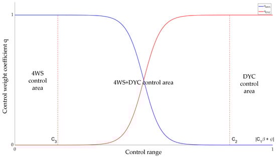 For the switching rules and control weights when the vehicle speed is higher than the critical vehicle speed , they are determined based on the control region corresponding to the vehicle’s current state. When the vehicle is in the 4WS control region, the control weight for 4WS and for DYC; when the vehicle is in the DYC region, the control weight for 4WS and for DYC; when the vehicle is in the 4WS + DYC region, the sigmoid function is used to redistribute the control weights of 4WS and DYC for joint control. The expression of the control weight is: