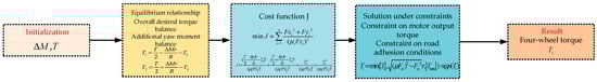 Firstly, to keep the vehicle’s longitudinal speed stable, the sum of the torques of the four wheels should equal the total expected torque , and the following condition must be satisfied: