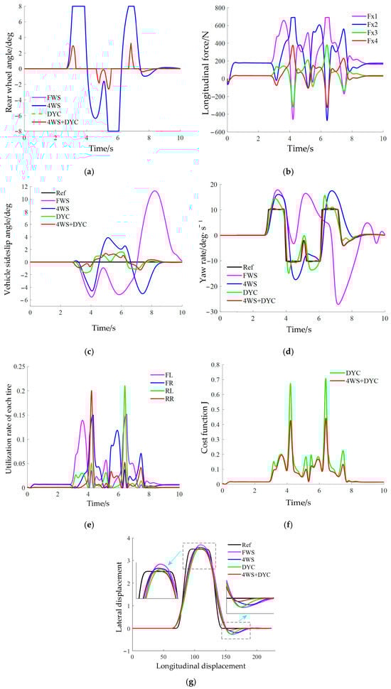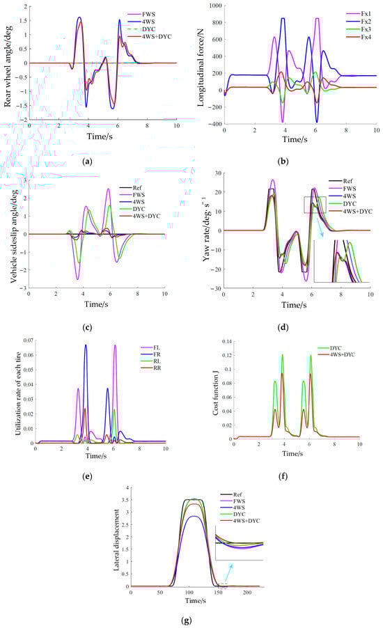 Double lane change maneuver ( = 80 km/h, = 0.4). (a) Rear-wheel angle; (b) Tire longitudinal force; (c) Vehicle sideslip angle; (d) Yaw rate; (e) Utilization rate of each tire; (f) Cost function J; (g) Vehicle trajectory.