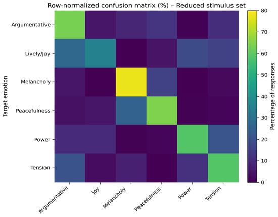 Row-normalized confusion matrix for the reduced stimulus set (56 musical fragments). Rows represent target emotion categories and columns represent participants’ classifications. Cell color indicates the percentage of responses assigned to each category within each target emotion. After exclusion of poorly recognized stimuli, classification accuracy increased across all emotion categories, with particularly strong within-category agreement for Melancholy, Peacefulness, and Power. High-arousal categories continued to show partial overlap, indicating graded rather than categorical emotion representations.