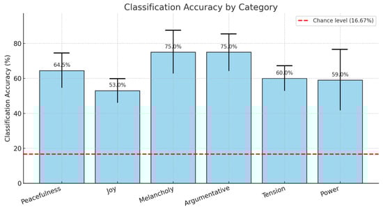 Classification accuracy by emotional category (hits). Mean classification accuracy (%) is displayed for each emotional category, with error bars indicating standard error of the mean (SEM). The red dashed line represents the theoretical chance level (16.67%), corresponding to random classification across six categories. Notably, all categories were classified significantly above chance, with the highest accuracy observed for Argumentative (75.0%) and Melancholy (75%) the lowest for Joy (53.0%). Please note that category-wise accuracy reflects recall (correct identification of the target emotion), whereas F1-scores additionally account for false-positive responses and therefore provide a more conservative measure of categorical reliability.