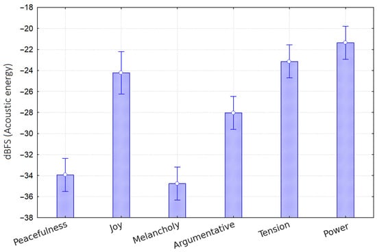 Mean acoustic energy (dBFS) across musical excerpts categorized by perceived emotional tone. Emotional categories were assigned based on listeners’ ratings. Bars show average root mean square (RMS) energy for each category, with error bars indicating ± 1 standard error of the mean (SEM). Perceived high-arousal tones such as Power and Tension, but also Joy were associated with significantly higher acoustic energy, whereas low-arousal tones like Peacefulness and Melancholy exhibited lower energy levels. Energy depended both on the intrinsic properties of the musical material and the expressive interpretation provided by the pianist.