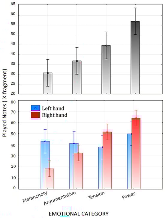An additional ANOVA was conducted on the number of notes played in minor key phrases, using as a factor the emotional category identified by participants (Melancholy, Argumentative, Tension, and Power). The analysis (Figure 5) revealed a significant main effect of emotional category [F (3,36) = 11.37, p < 0.00002, η2p = 0.49] and of its interaction with Hand [F (3,36) = 10.37, p < 0.00005, η2p = 0.46]. Post hoc comparisons revealed comparable levels of structural complexity (as indexed by the number of notes played) between the melancholic and argumentative fragments, albeit with a trend toward increased complexity in the latter. A marked rise in complexity was observed in fragments conveying tension or struggle (p < 0.005), and an even more pronounced increase was noted in those associated with the expression of power (p < 0.001). Notably, the interaction between factors indicated that this effect was specific to the right-hand piano part, with no significant differences emerging in the left-hand part as a function of emotional category. Interestingly, the left hand (reflecting right-hemispheric engagement) was significantly more involved in executing notation associated with low-arousal affective states—such as Melancholy (p < 0.0001)—whereas the right hand exhibited greater involvement in performing notation linked to high-arousal states, such as Power (p < 0.02), as evidenced by post hoc analyses.