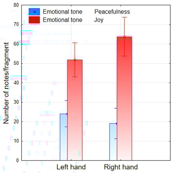 Manual distribution of note execution as a function of emotional tone. Bar plot illustrating the number of notes per fragment performed by the left and right hands for two contrasting emotional states: Peacefulness (low-arousal) and Joy (high-arousal). While no significant lateral asymmetry was observed for Peacefulness, Joy elicited a markedly greater involvement of the right hand, suggesting a motoric correlate of emotional arousal. Error bars represent standard error of the mean (SEM).