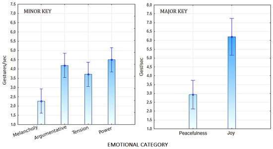 A further ANOVA was conducted on the number of gestures/sec, reflecting both executive complexity, and motoric energy, for fragments in minor and major modes, respectively. The first ANOVA showed the significance of Emotional category [F (3,36) = 9.44, p < 0.00001, η2p = 0.44]. Post hoc comparisons indicated a markedly lower execution speed (gestures per second) in fragments perceived as expressing Melancholy, compared to other types of emotional states conveyed in the minor key (see Figure 7). The second ANOVA also revealed a significant main effect of Emotional Category [F (1,14) = 28.24, p < 0.0001, η2p = 0.67], with a markedly higher execution speed observed for fragments conveying Joy compared to those expressing Peacefulness.