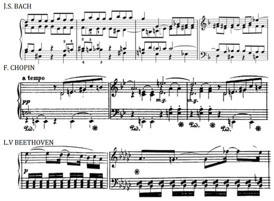 Representative excerpts highlighting the extreme stylistic differences in considered piano works by Bach, Chopin, and Beethoven. The musical passages correspond to J. S. Bach’s The Art of Fugue (BWV 1080), specifically Contrapunctus XI, mm. 153–156 (top); Frédéric Chopin’s Ballade No. 1 in G minor, Op. 23, mm. 94–96 (middle); and Ludwig van Beethoven’s Piano Sonata in A♭ major, Op. 110, mm. 10–11 (bottom). Each excerpt exemplifies the composer’s distinct approach to thematic development and texture—from Bach’s intricate fugal counterpoint, to Chopin’s dramatic lyricism and pianistic idiom, and Beethoven’s late-period synthesis of structural clarity and expressive depth.