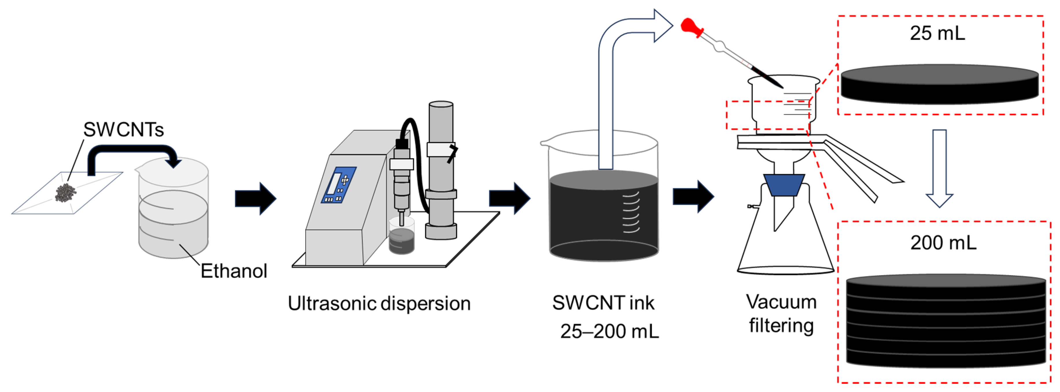- Ochiai, S.; Shinozaki, Y.; Eguchi, A.; Nagai, K.; Miyake, S.; Takashiri, M. Evaluation of thermal transport in composite SWCNT films with pseudo-heterogeneous interfaces obtained by blending different SWCNTs. Diamond Relat. Mater. 2025, 159, 112925. [Google Scholar] [CrossRef]