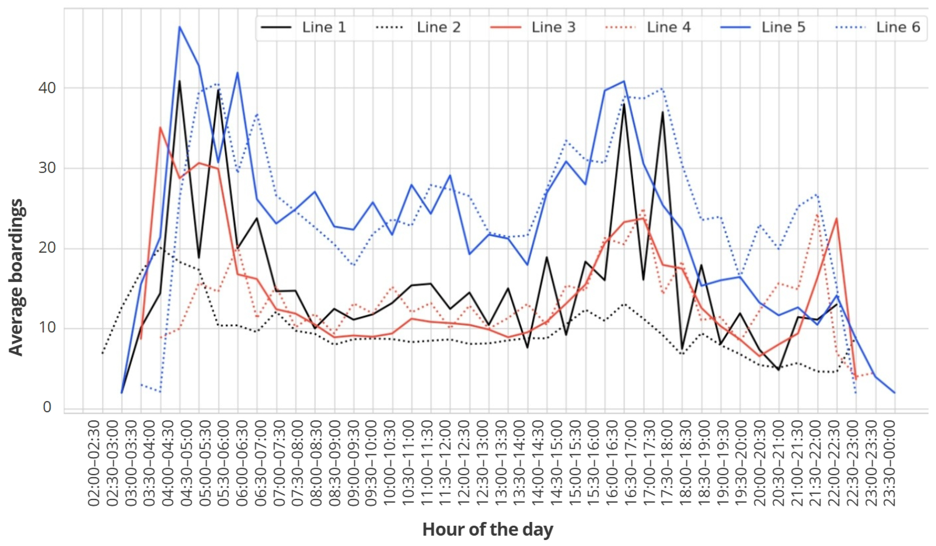 Figure 2 reveals the peak-period of demand across routes. During the morning peak (04:30–07:00), Lines 1, 5 and 6 display the highest boarding levels, with sharp increases relative to off-peak periods, indicating strong commuter-oriented demand. Line 5 shows a particularly morning ramp-up, consistent with inter-zonal work-related travel, while Line 6, despite operating within a single zone, also concentrates substantial demand during this period. In the evening peak (15:00–18:30), Lines 1, 5 and 6 again display an absolute increase in passenger volume, suggesting a return-flow symmetry. Line 2, by contrast, maintain relatively even boarding levels across both peak and non-peak periods, as the only line that covers all zones. Each line has overall unique fluctuations, with different tendencies in the deviations. These distinct patterns justify the use of a specialized approach to capture the unique characteristics of each line.