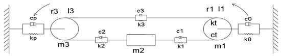 • m 3 , r 3 , I 3 —Equivalent mass of the auxiliary-side base structure, equivalent radius, and equivalent moment of inertia of the tensioning wheel.