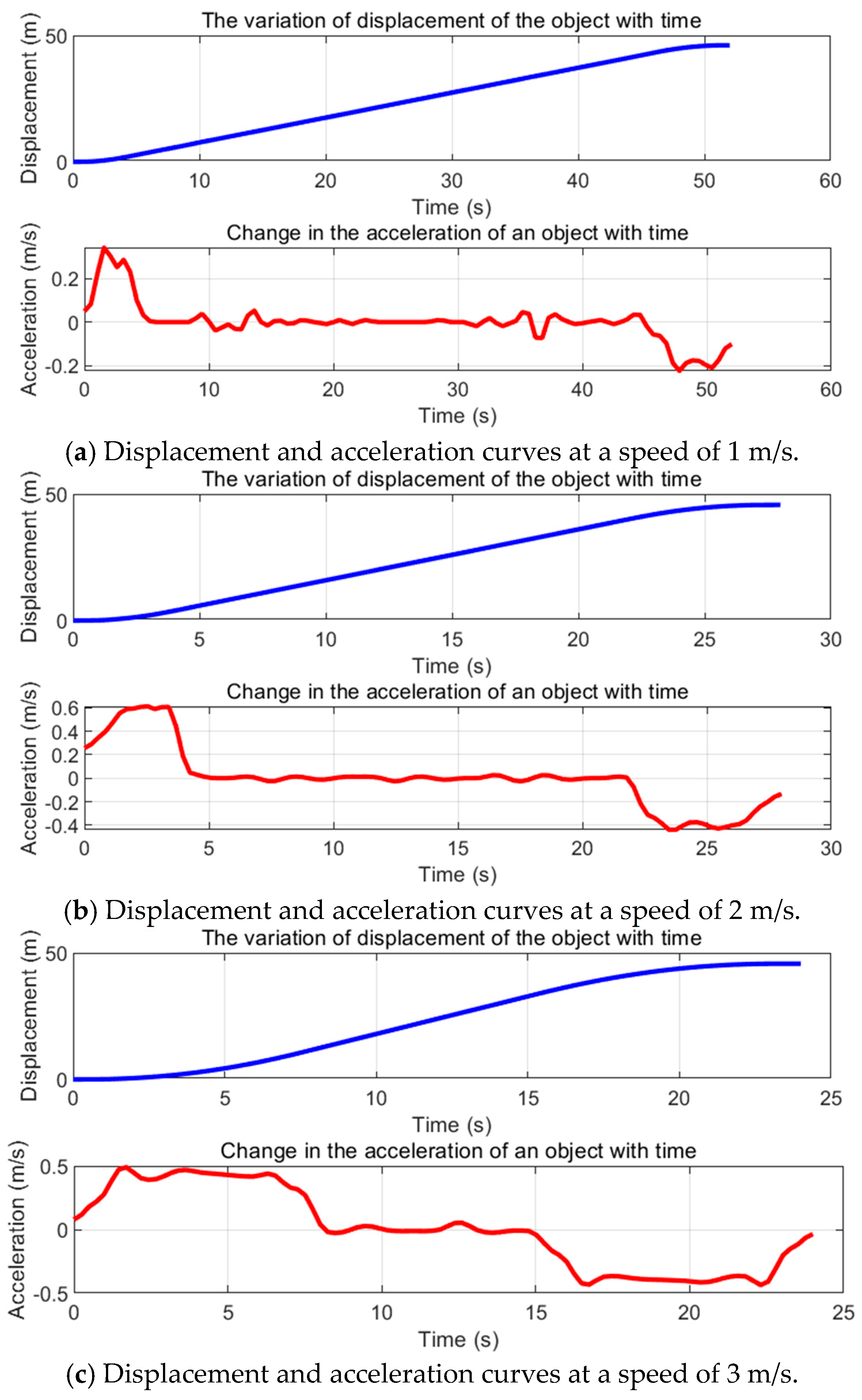 To investigate the motion states of the system during operation, a linear velocity measuring wheel was installed at the traction cable’s towing end. The linear velocity and accumulated circumference of the wheel’s outer circle were calculated from the wheel’s rotational speed and circumference, enabling real-time and accurate measurement of the model’s towing velocity and displacement. These data were then subjected to cubic interpolation for refinement. Following this, these data were differentiated to obtain the vehicle’s displacement and acceleration curves at a depth of 2 m for speeds of 1 m/s, 2 m/s, and 3 m/s, as shown in Figure 3.