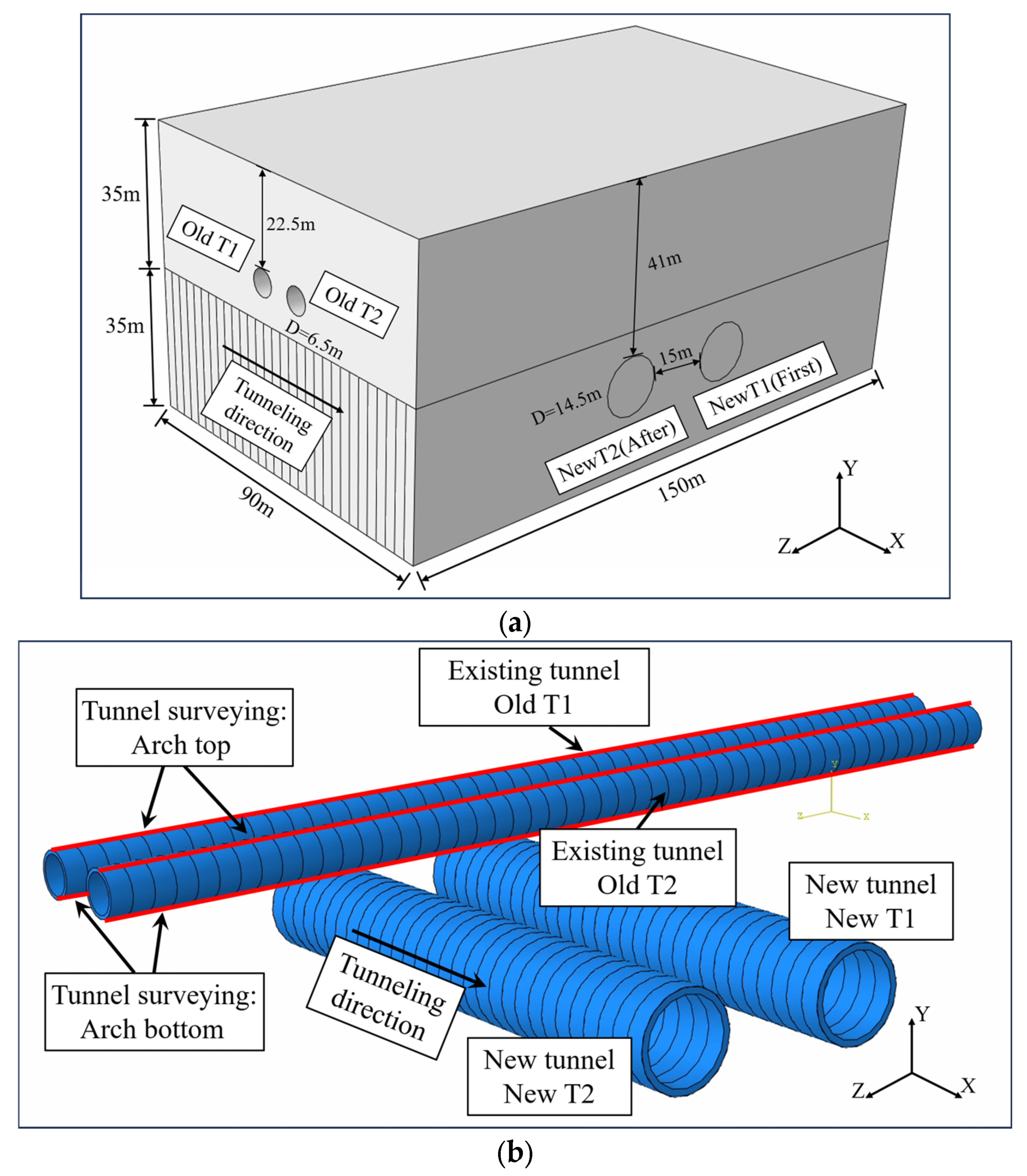 - Lu, D.C.; Song, T.; Lin, Q.T.; Meng, X.; Du, X.L. Numerical simulation study on deformation mechanism of existing tunnels induced by shield undercrossing. J. Disaster Prev. Mitig. Eng. 2025, 45, 485–500. [Google Scholar]